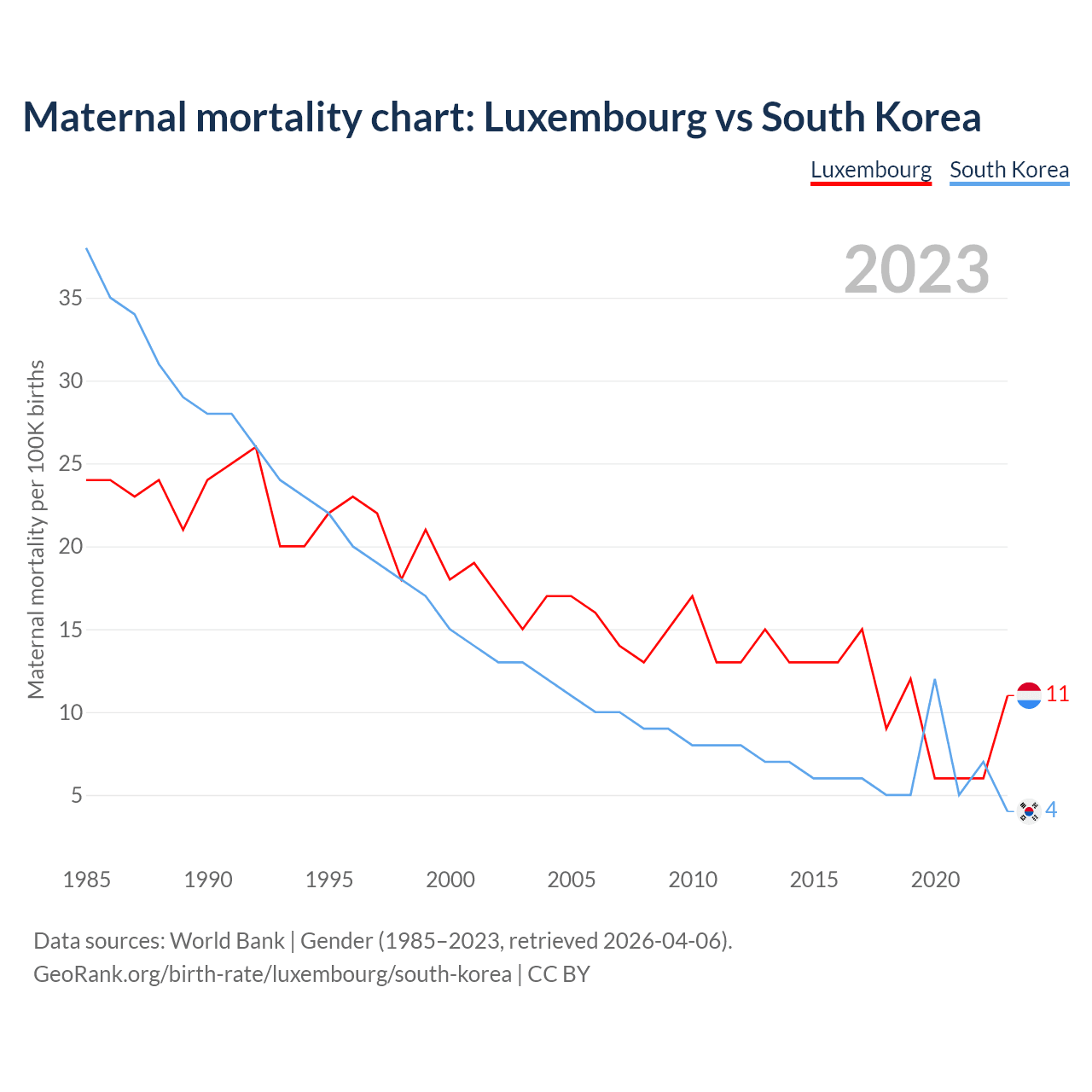 The maternal mortality rate, which is the probability of dying during childbirth or within 42 days of pregnancy termination, is 11 deaths per 100,000 live births in Luxembourg, compared to 4 deaths in South Korea.