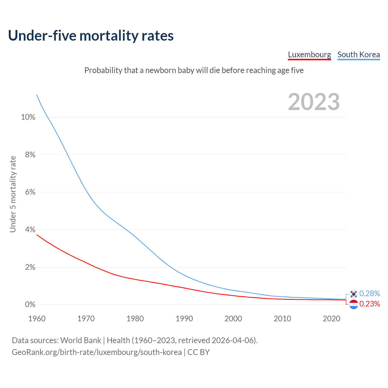 The chance that a newborn baby will die before reaching age five is 0.23% in Luxembourg and 0.28% in South Korea. Above is a chart with historical data on under-five mortality rates.
