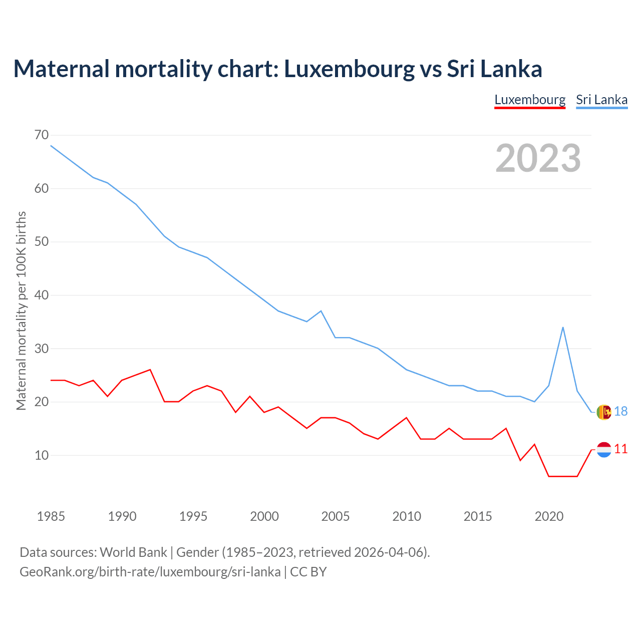The maternal mortality rate, which is the probability of dying during childbirth or within 42 days of pregnancy termination, is 11 deaths per 100,000 live births in Luxembourg, compared to 18 deaths in Sri Lanka.