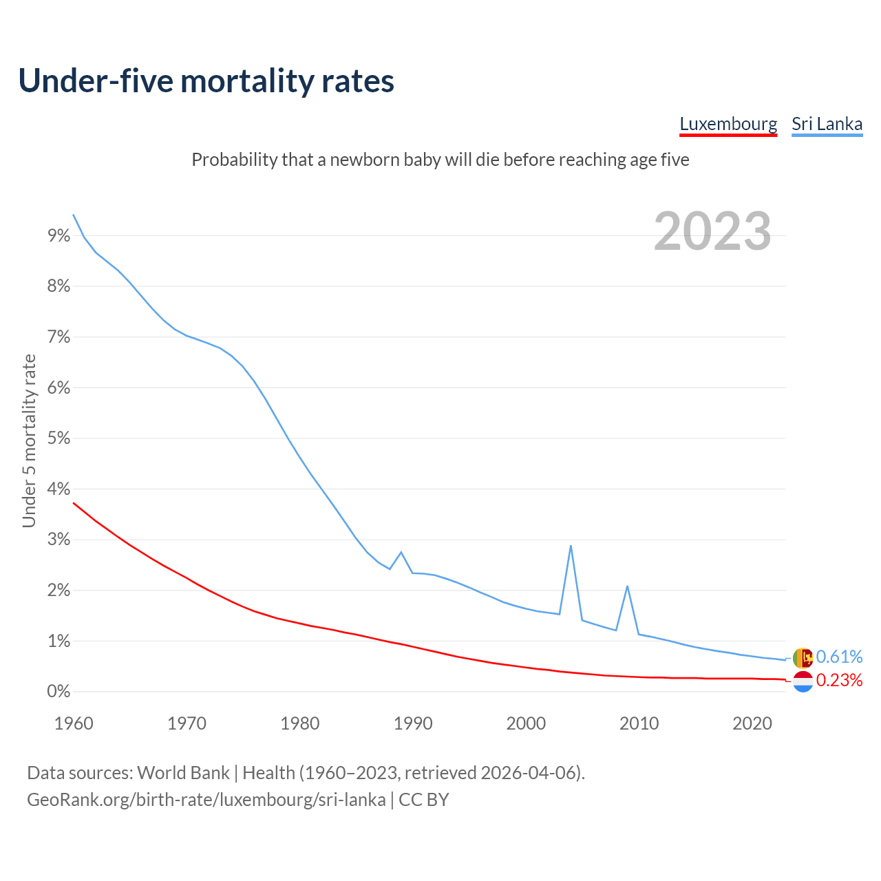 The chance that a newborn baby will die before reaching age five is 0.23% in Luxembourg and 0.61% in Sri Lanka. Above is a chart with historical data on under-five mortality rates.
