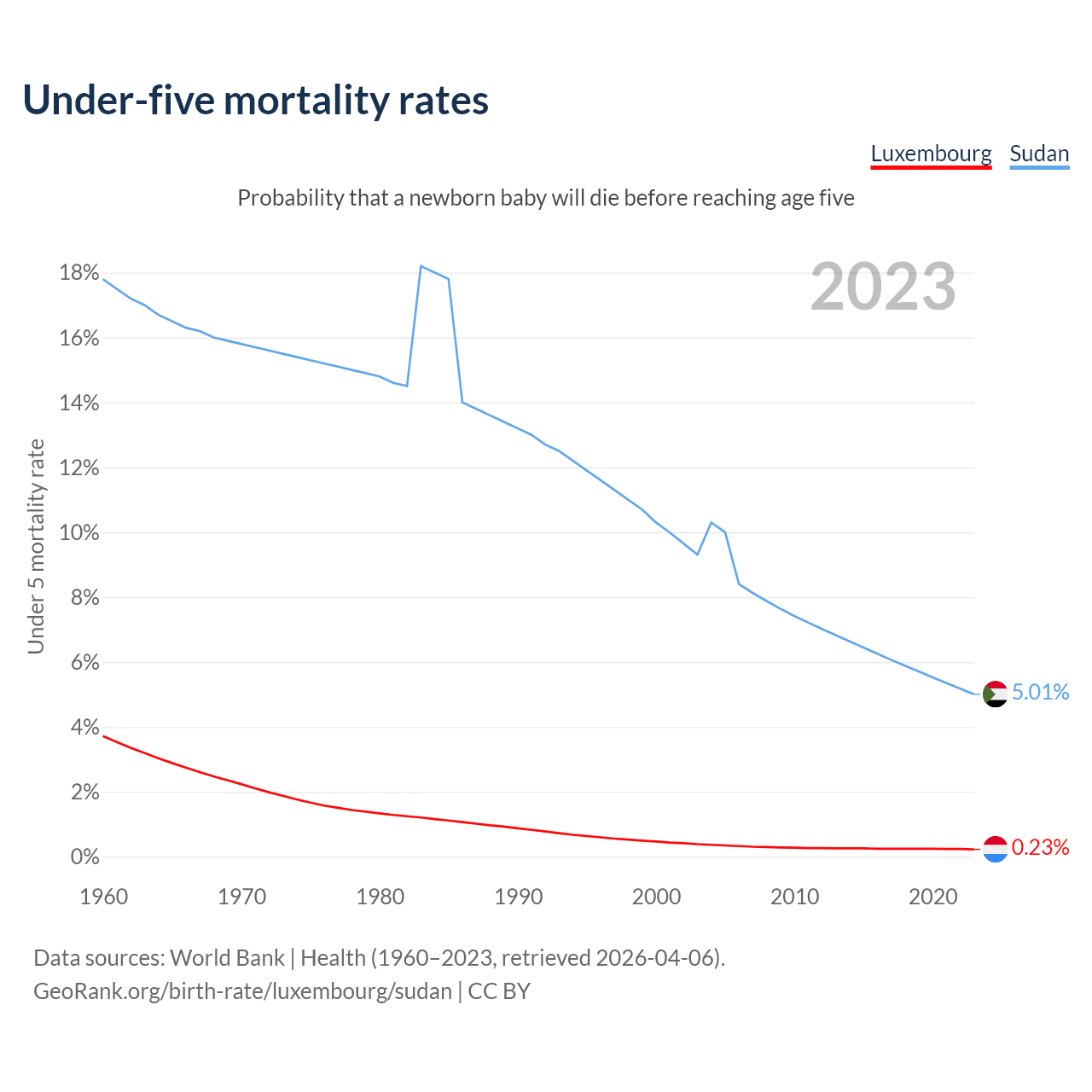 The chance that a newborn baby will die before reaching age five is 0.23% in Luxembourg and 5.01% in Sudan. Above is a chart with historical data on under-five mortality rates.