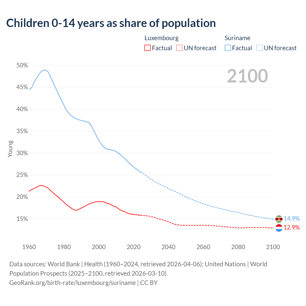 According to the latest available data on birth rates, the fertility rate in Luxembourg was 1.25 children per woman in 2023, compared to 2.25 in Suriname in 2023. The replacement level is considered to be 2.1 children per woman.