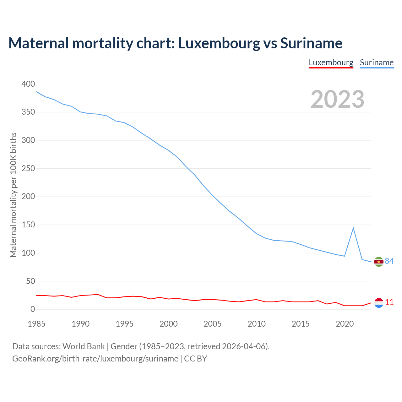 The maternal mortality rate, which is the probability of dying during childbirth or within 42 days of pregnancy termination, is 11 deaths per 100,000 live births in Luxembourg, compared to 84 deaths in Suriname.