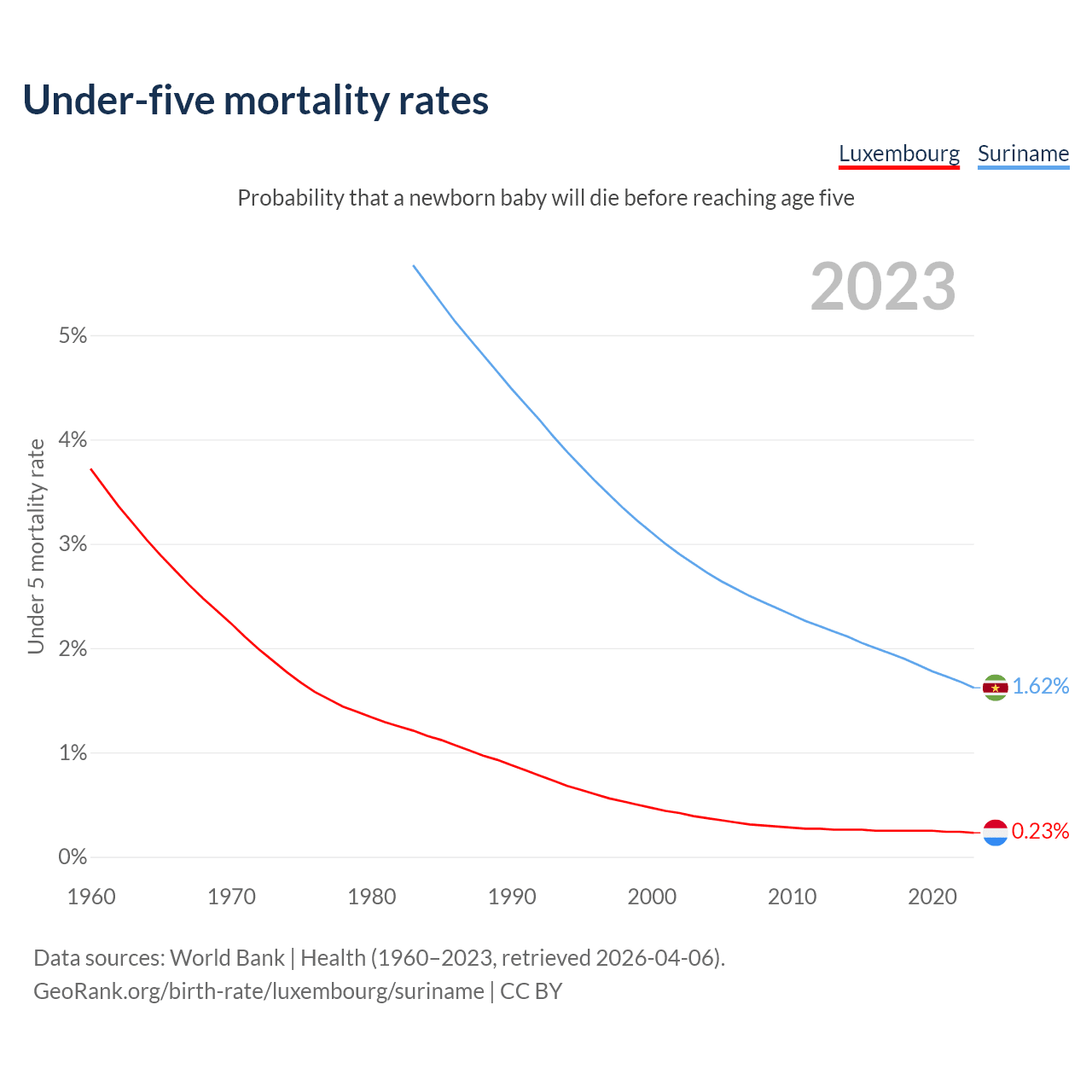 The chance that a newborn baby will die before reaching age five is 0.23% in Luxembourg and 1.62% in Suriname. Above is a chart with historical data on under-five mortality rates.