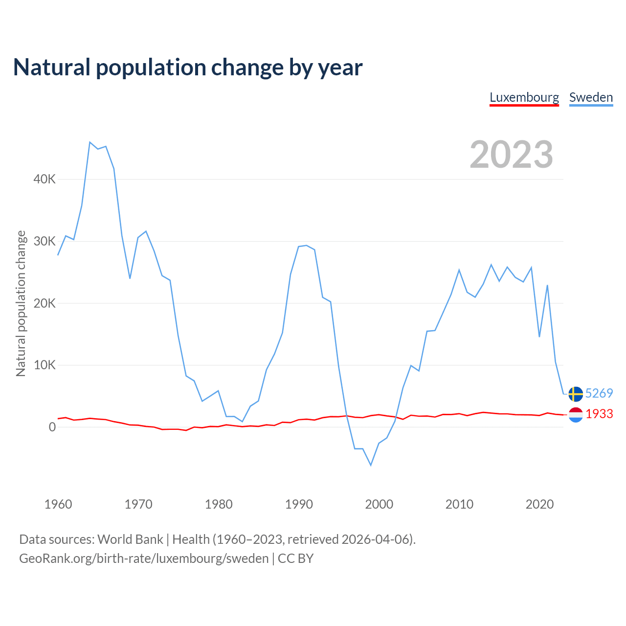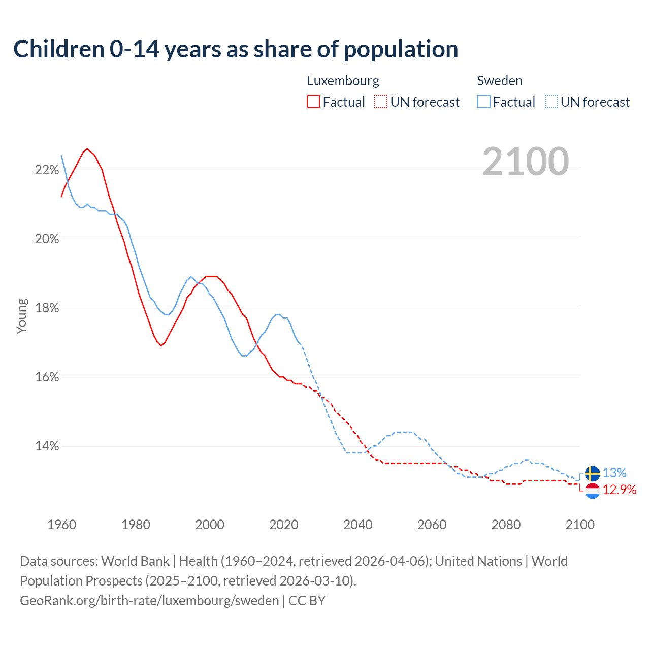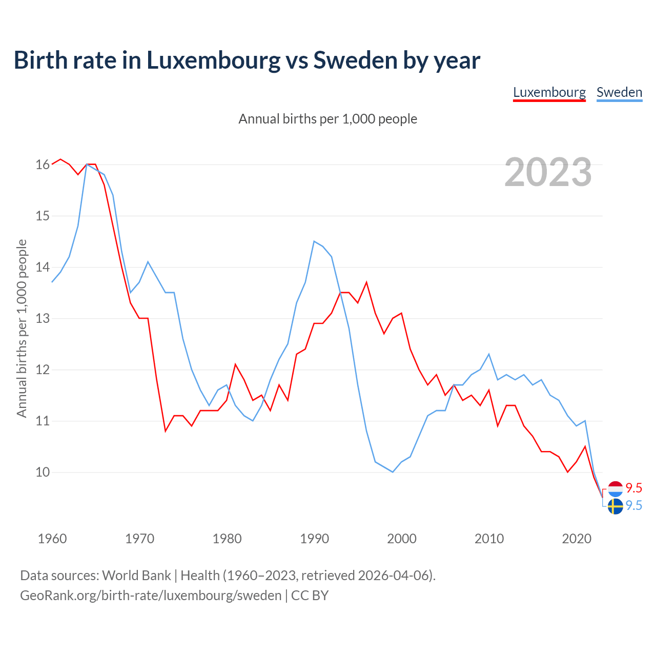Luxembourg has an annual birth rate of 9.5 births per 1,000 people, compared to 9.5 for Sweden. The average number of children a woman is expected to have during her lifetime — the fertility rate, is 1.25 in Luxembourg and 1.45 in Sweden — 16% difference.