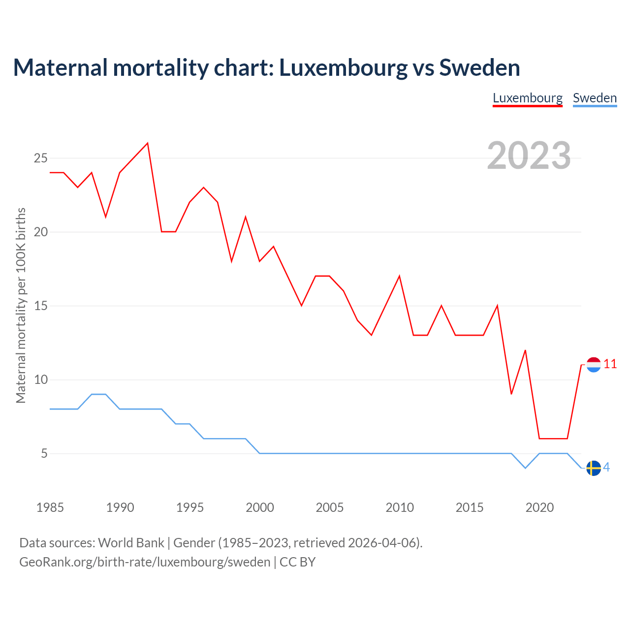 The maternal mortality rate, which is the probability of dying during childbirth or within 42 days of pregnancy termination, is 11 deaths per 100,000 live births in Luxembourg, compared to 4 deaths in Sweden.