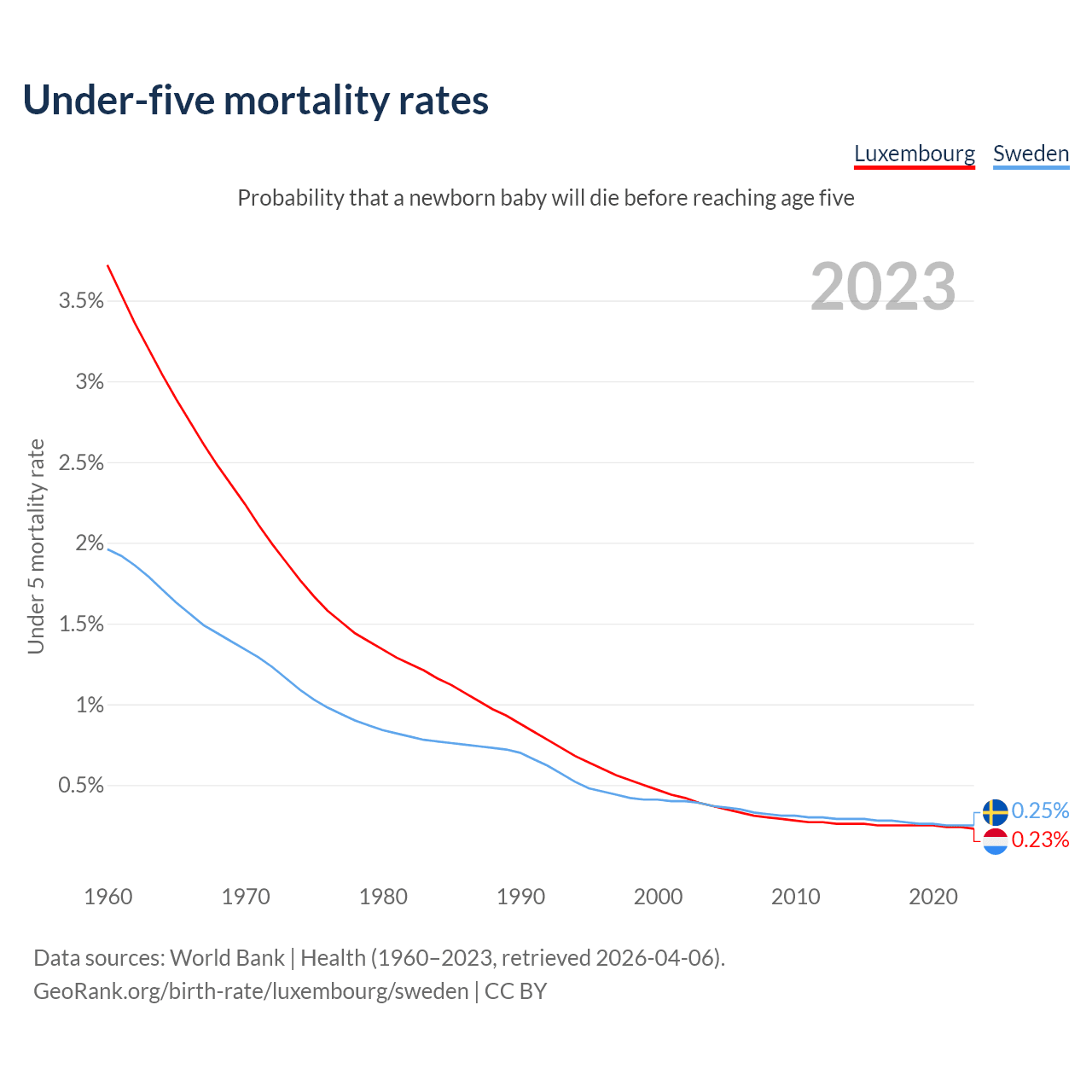 The chance that a newborn baby will die before reaching age five is 0.23% in Luxembourg and 0.25% in Sweden. Above is a chart with historical data on under-five mortality rates.