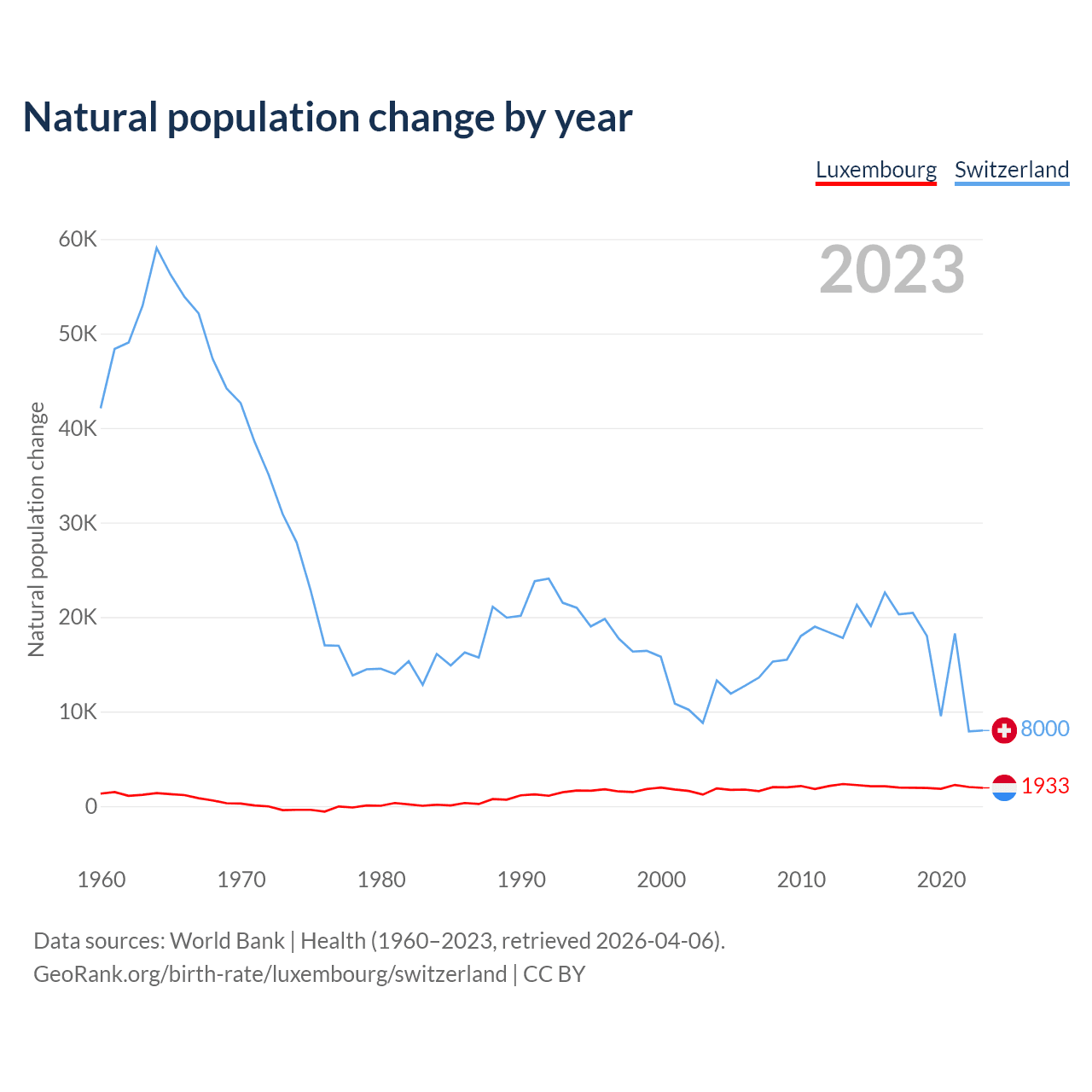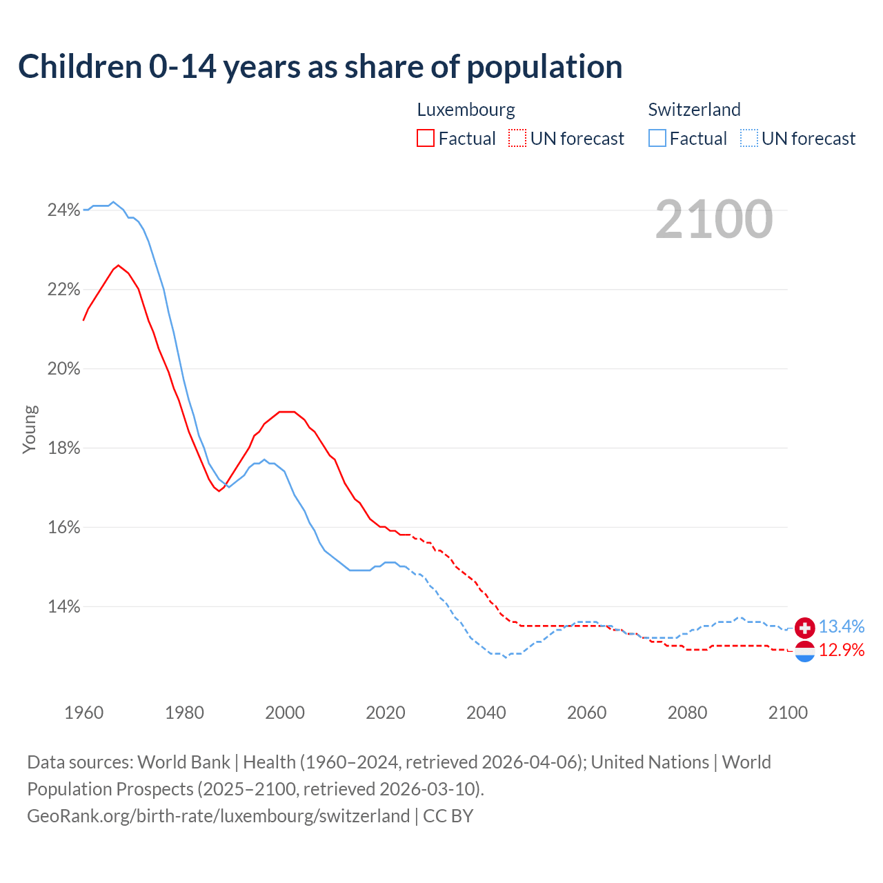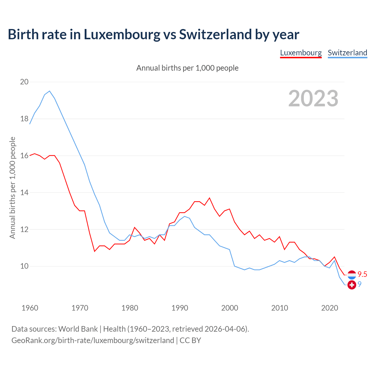 Luxembourg has an annual birth rate of 9.5 births per 1,000 people, compared to 9 for Switzerland. The average number of children a woman is expected to have during her lifetime — the fertility rate, is 1.25 in Luxembourg and 1.33 in Switzerland — 6.4% difference.