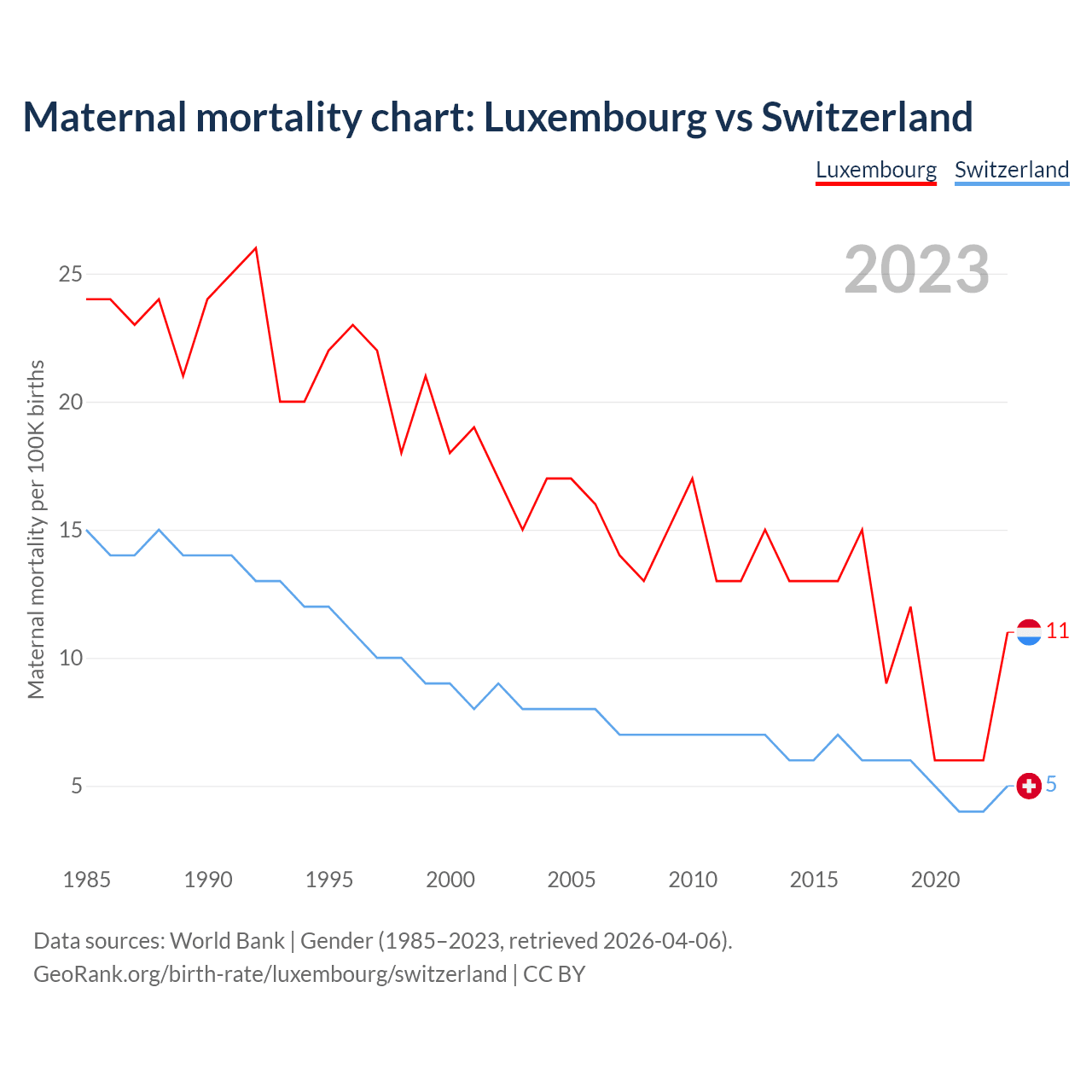 The maternal mortality rate, which is the probability of dying during childbirth or within 42 days of pregnancy termination, is 11 deaths per 100,000 live births in Luxembourg, compared to 5 deaths in Switzerland.