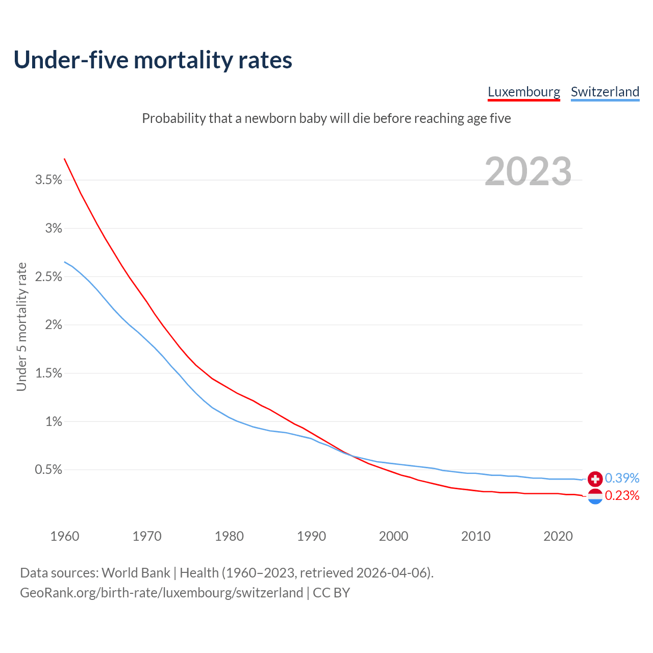 The chance that a newborn baby will die before reaching age five is 0.23% in Luxembourg and 0.39% in Switzerland. Above is a chart with historical data on under-five mortality rates.