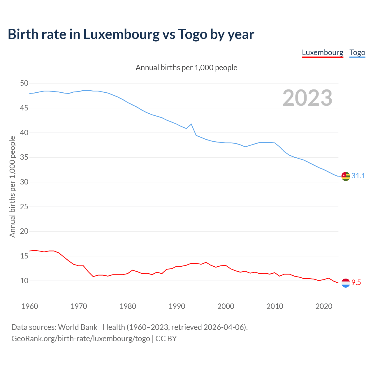 Luxembourg has an annual birth rate of 9.5 births per 1,000 people, compared to 31.1 for Togo. The average number of children a woman is expected to have during her lifetime — the fertility rate, is 1.25 in Luxembourg and 4.19 in Togo — 235.4% difference.