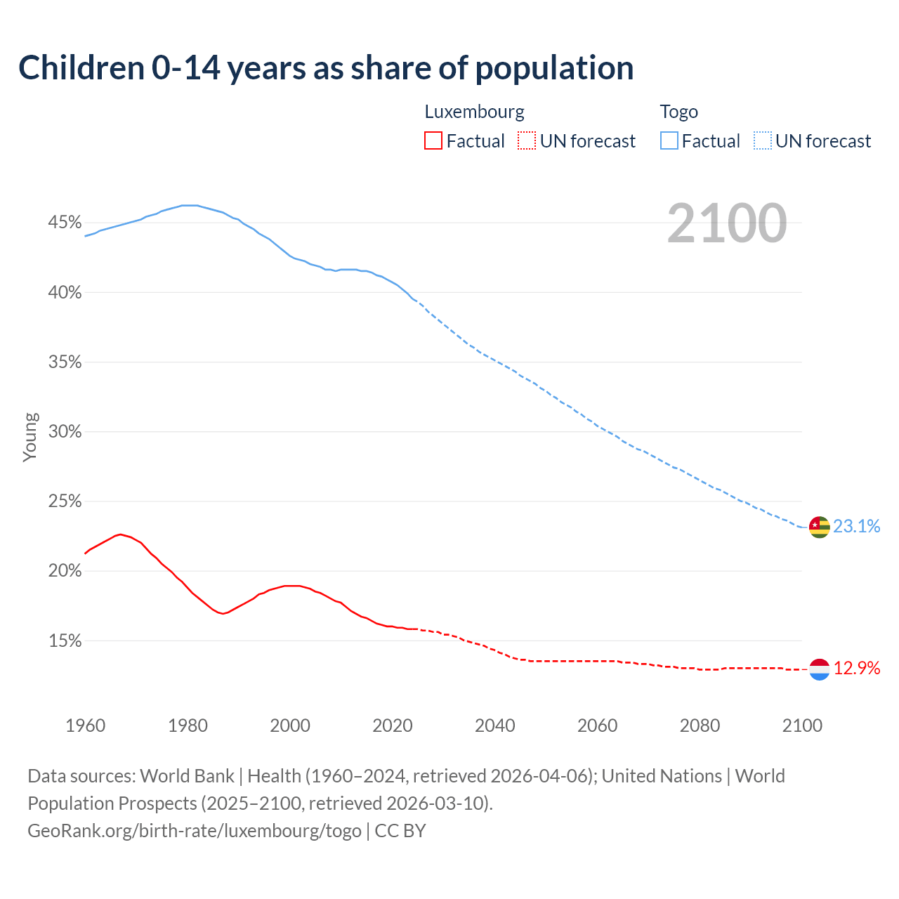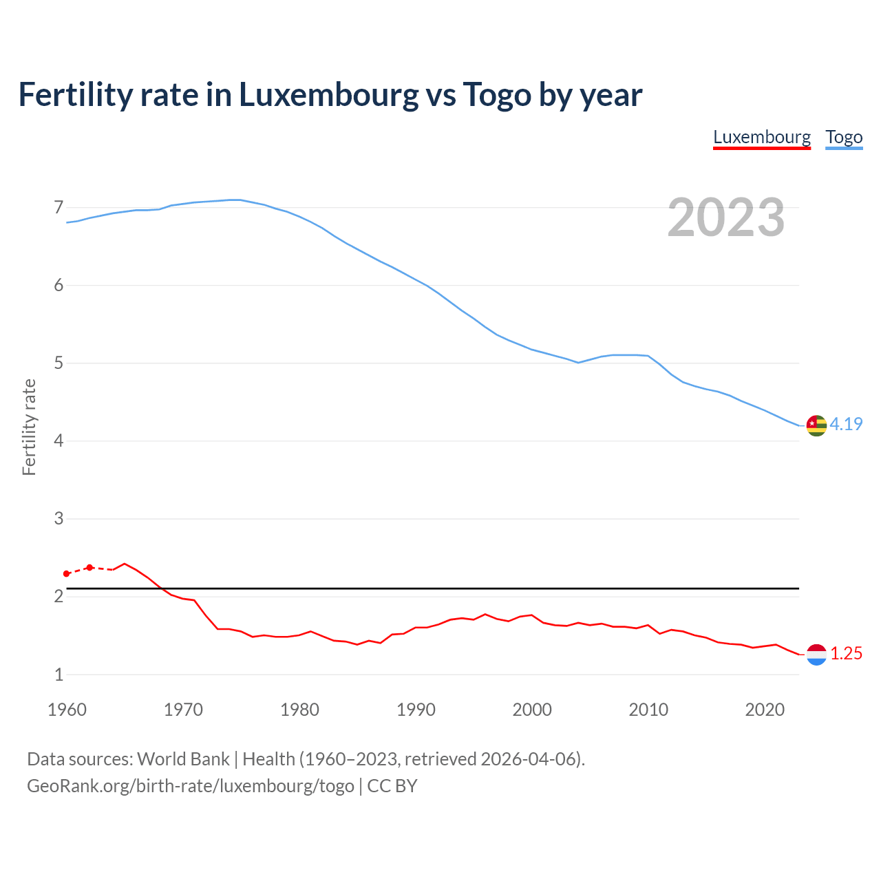 According to the latest available data on birth rates, the fertility rate in Luxembourg was 1.25 children per woman in 2023, compared to 4.19 in Togo in 2023. The replacement level is considered to be 2.1 children per woman.