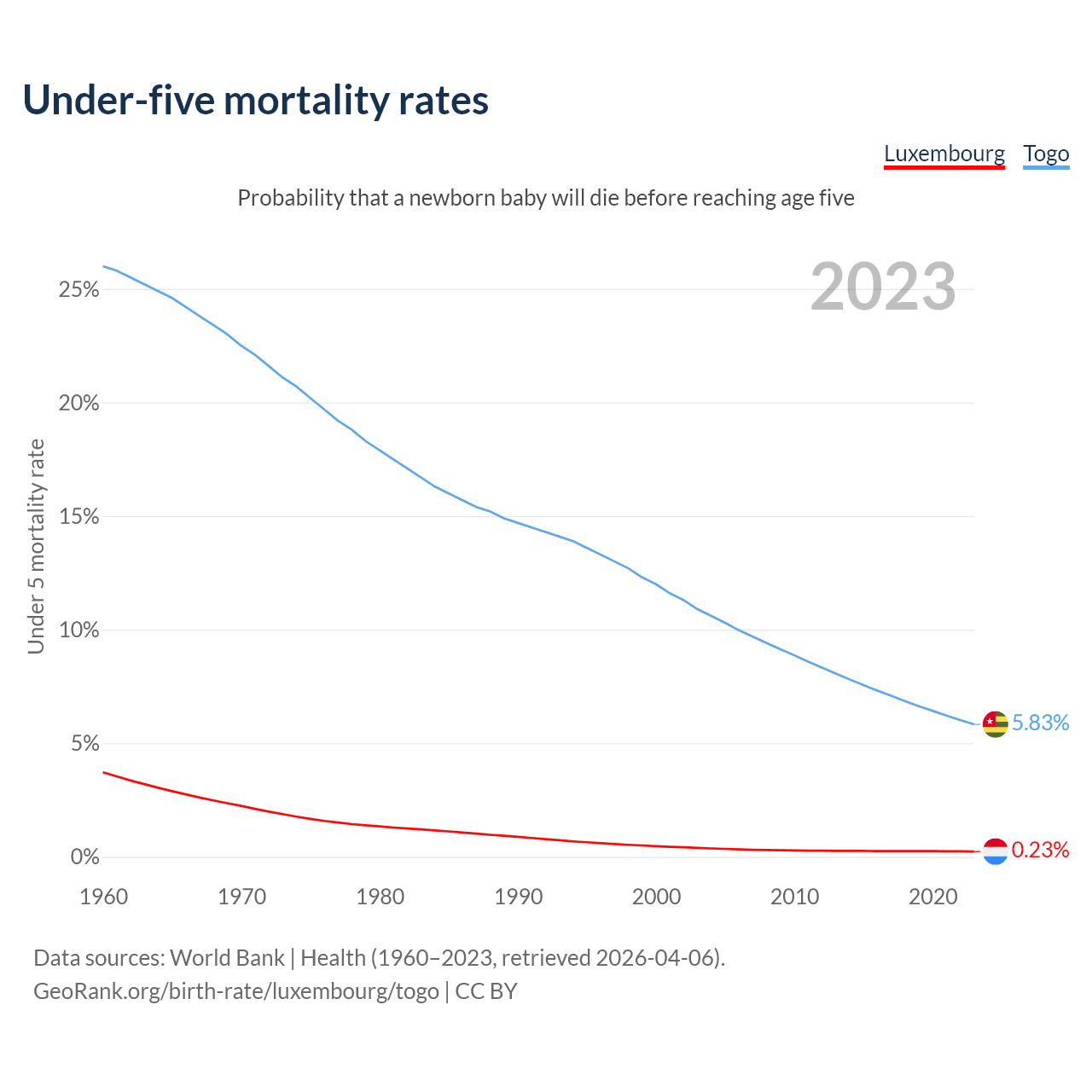 The chance that a newborn baby will die before reaching age five is 0.23% in Luxembourg and 5.83% in Togo. Above is a chart with historical data on under-five mortality rates.