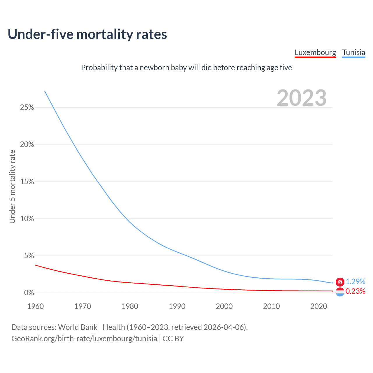 The chance that a newborn baby will die before reaching age five is 0.23% in Luxembourg and 1.29% in Tunisia. Above is a chart with historical data on under-five mortality rates.