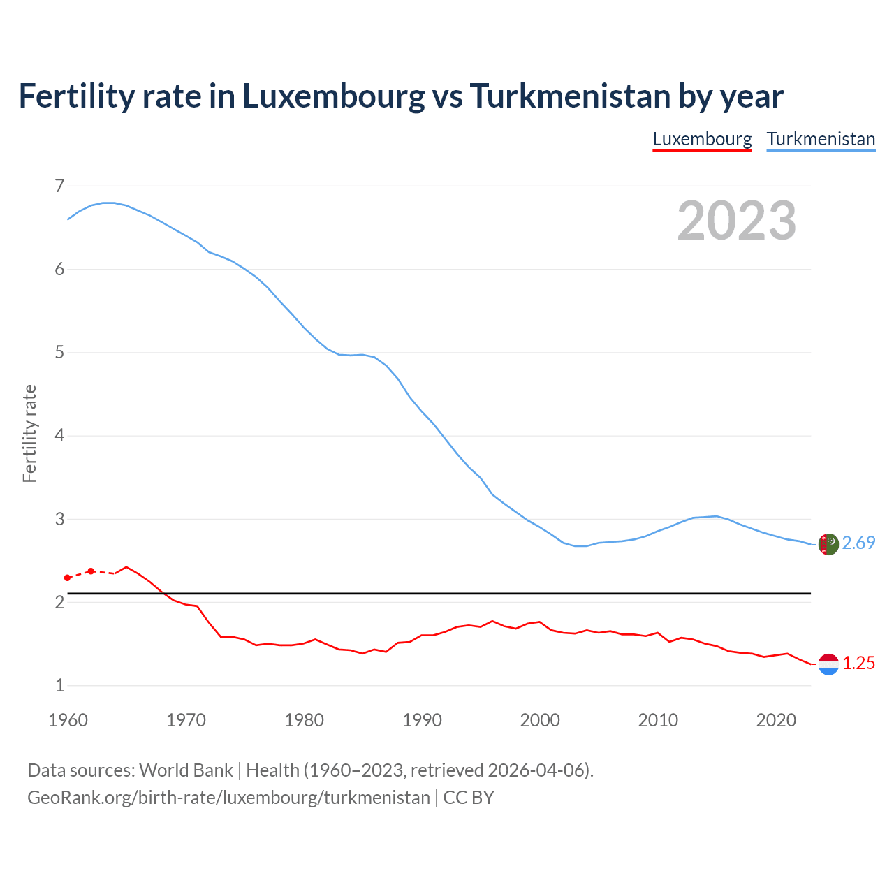 According to the latest available data on birth rates, the fertility rate in Luxembourg was 1.25 children per woman in 2023, compared to 2.69 in Turkmenistan in 2023. The replacement level is considered to be 2.1 children per woman.