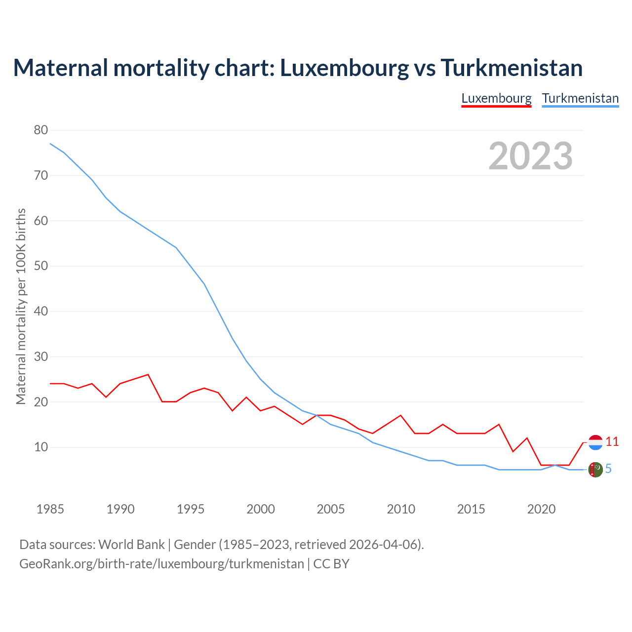 The maternal mortality rate, which is the probability of dying during childbirth or within 42 days of pregnancy termination, is 11 deaths per 100,000 live births in Luxembourg, compared to 5 deaths in Turkmenistan.