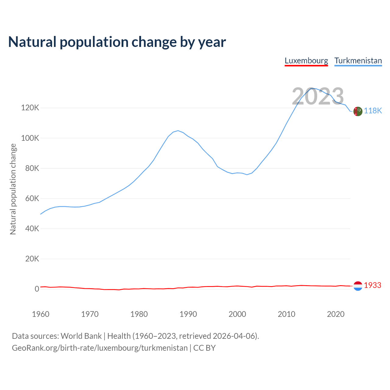 Luxembourg has an annual birth rate of 9.5 births per 1,000 people, compared to 21.7 for Turkmenistan. The average number of children a woman is expected to have during her lifetime — the fertility rate, is 1.25 in Luxembourg and 2.69 in Turkmenistan — 115.2% difference.