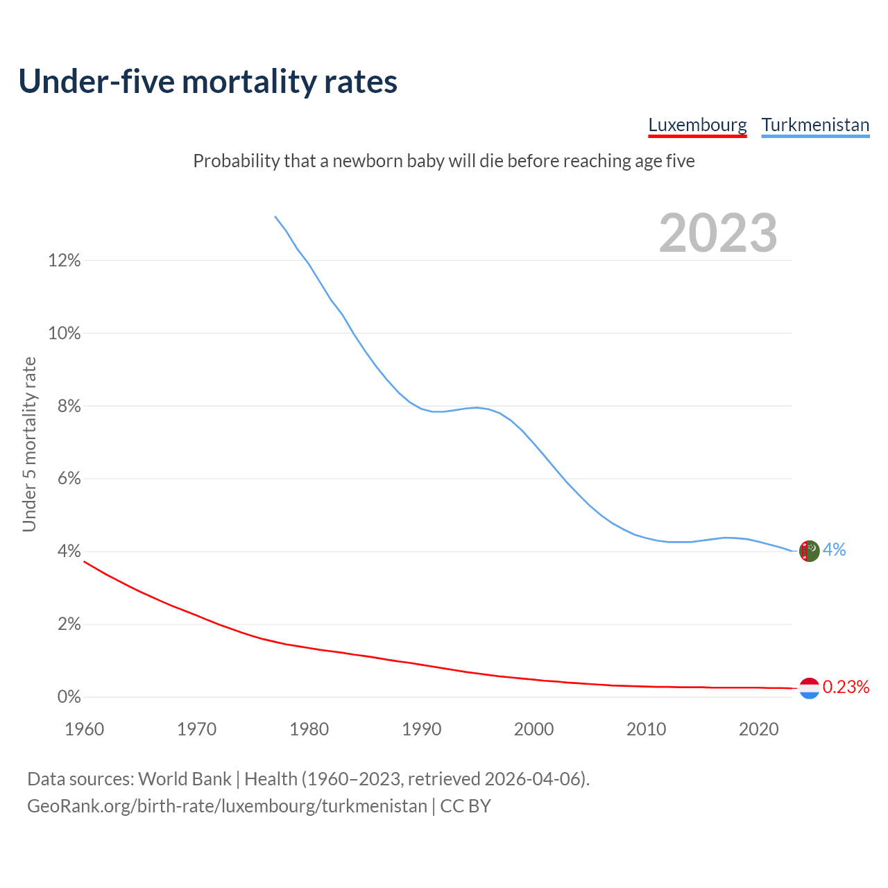 The chance that a newborn baby will die before reaching age five is 0.23% in Luxembourg and 4% in Turkmenistan. Above is a chart with historical data on under-five mortality rates.
