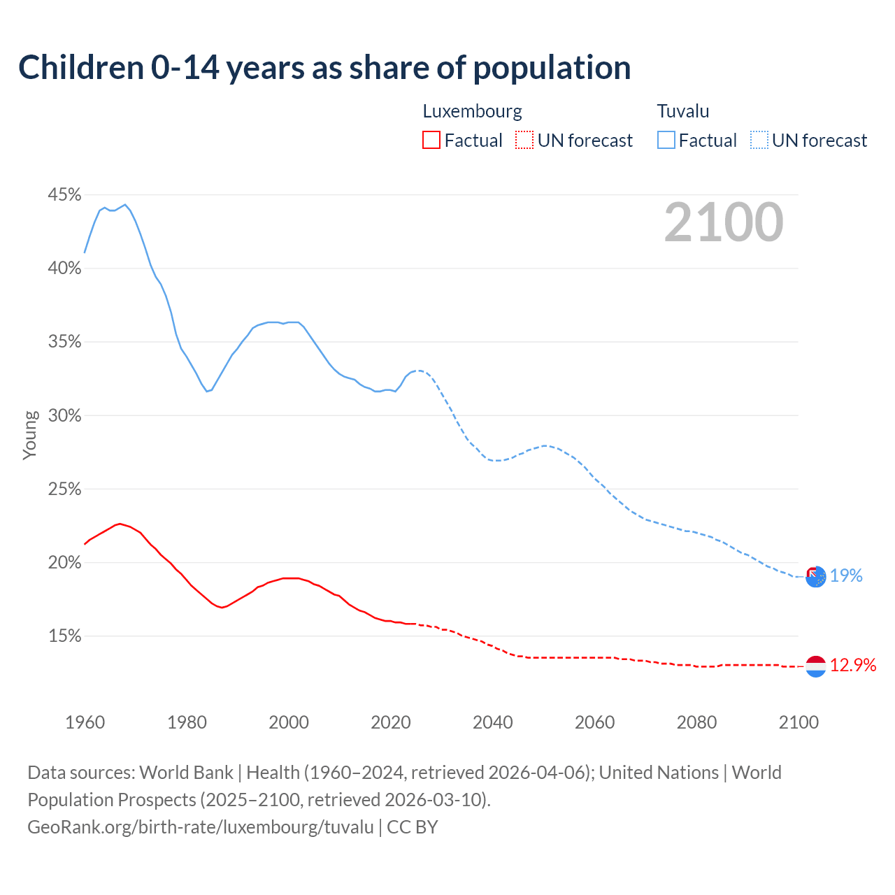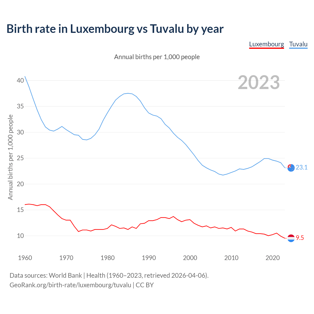 Luxembourg has an annual birth rate of 9.5 births per 1,000 people, compared to 23.1 for Tuvalu. The average number of children a woman is expected to have during her lifetime — the fertility rate, is 1.25 in Luxembourg and 3.21 in Tuvalu — 156.6% difference.