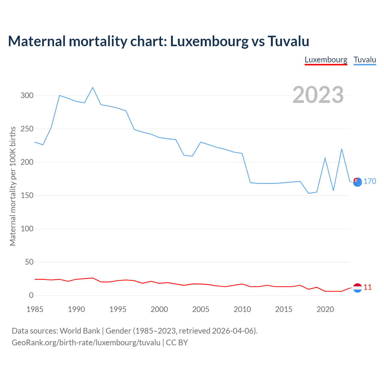 The maternal mortality rate, which is the probability of dying during childbirth or within 42 days of pregnancy termination, is 11 deaths per 100,000 live births in Luxembourg, compared to 170 deaths in Tuvalu.