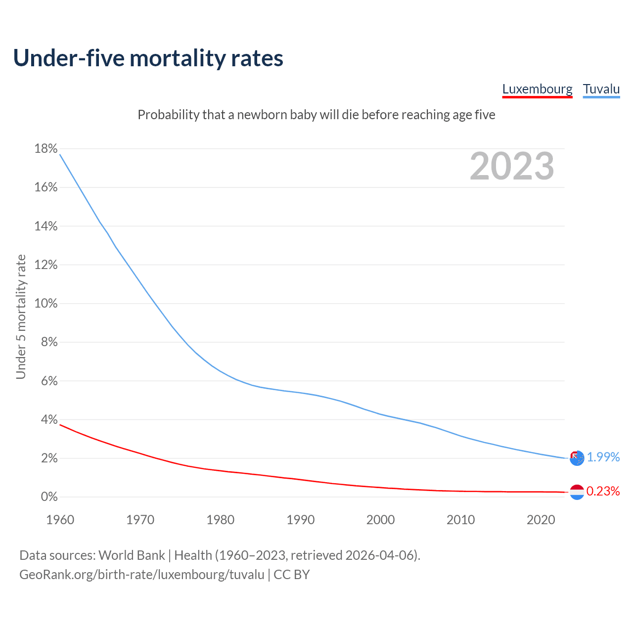The chance that a newborn baby will die before reaching age five is 0.23% in Luxembourg and 1.99% in Tuvalu. Above is a chart with historical data on under-five mortality rates.