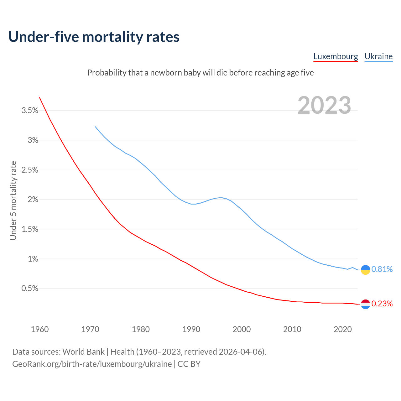 The chance that a newborn baby will die before reaching age five is 0.23% in Luxembourg and 0.81% in Ukraine. Above is a chart with historical data on under-five mortality rates.