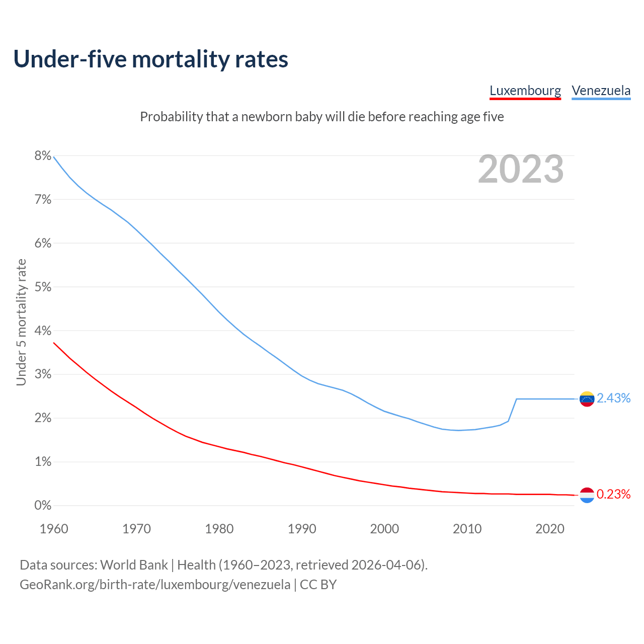 The chance that a newborn baby will die before reaching age five is 0.23% in Luxembourg and 2.43% in Venezuela. Above is a chart with historical data on under-five mortality rates.