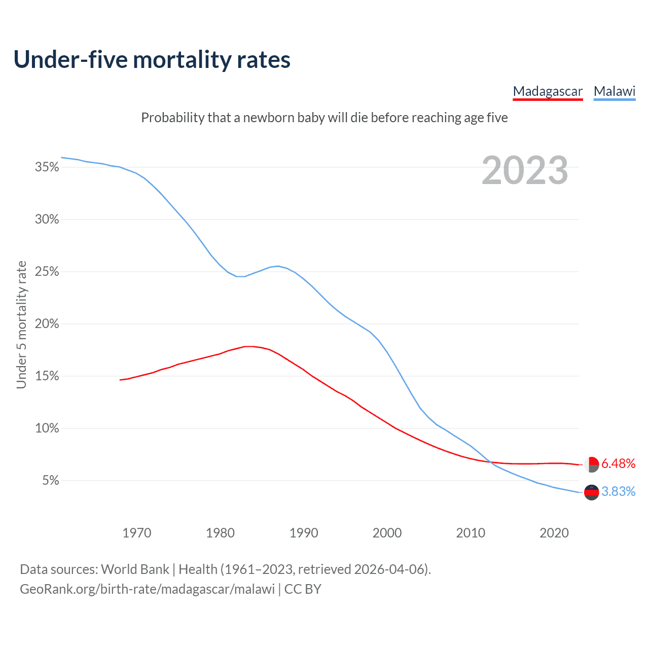 The chance that a newborn baby will die before reaching age five is 6.48% in Madagascar and 3.83% in Malawi. Above is a chart with historical data on under-five mortality rates.