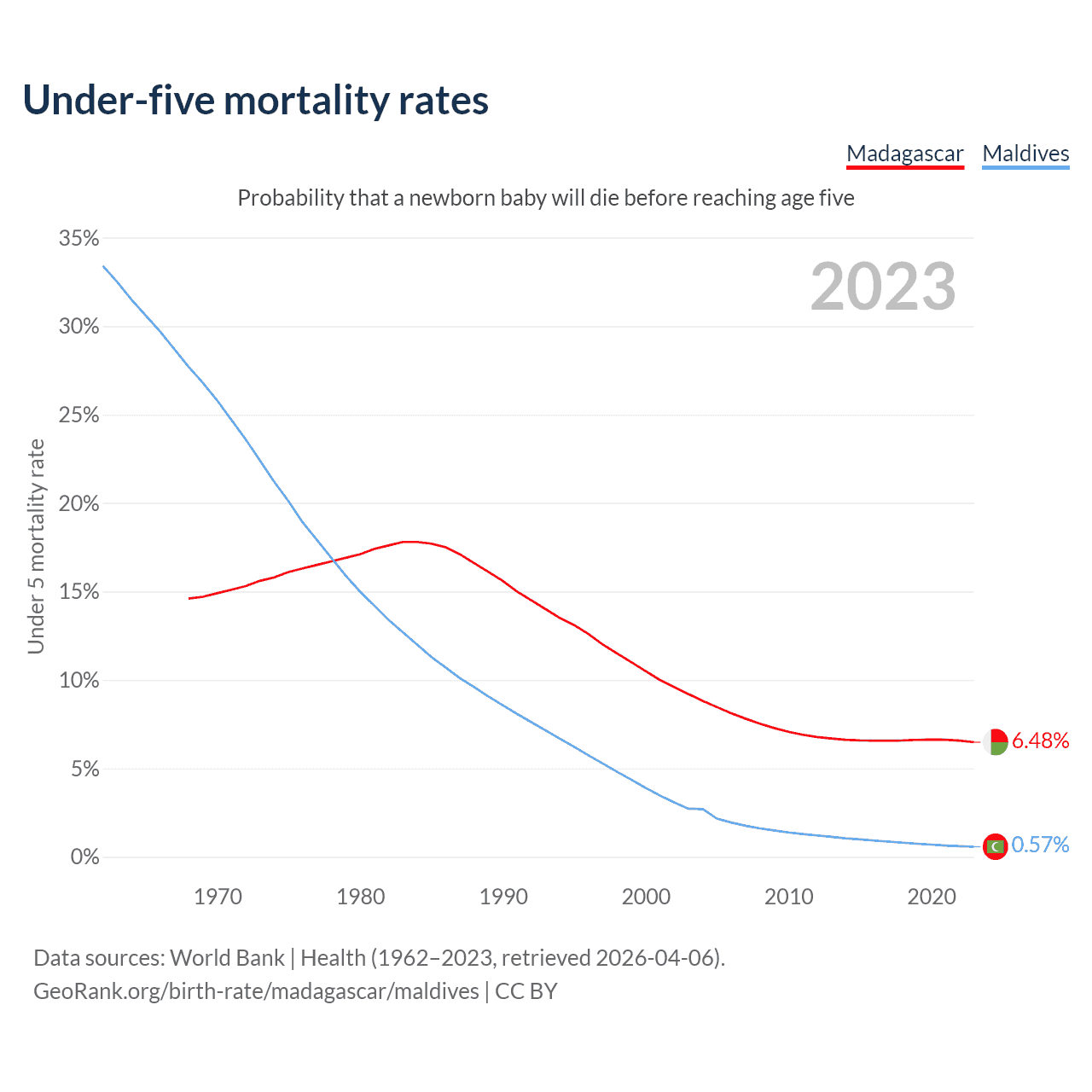 The chance that a newborn baby will die before reaching age five is 6.48% in Madagascar and 0.57% in Maldives. Above is a chart with historical data on under-five mortality rates.