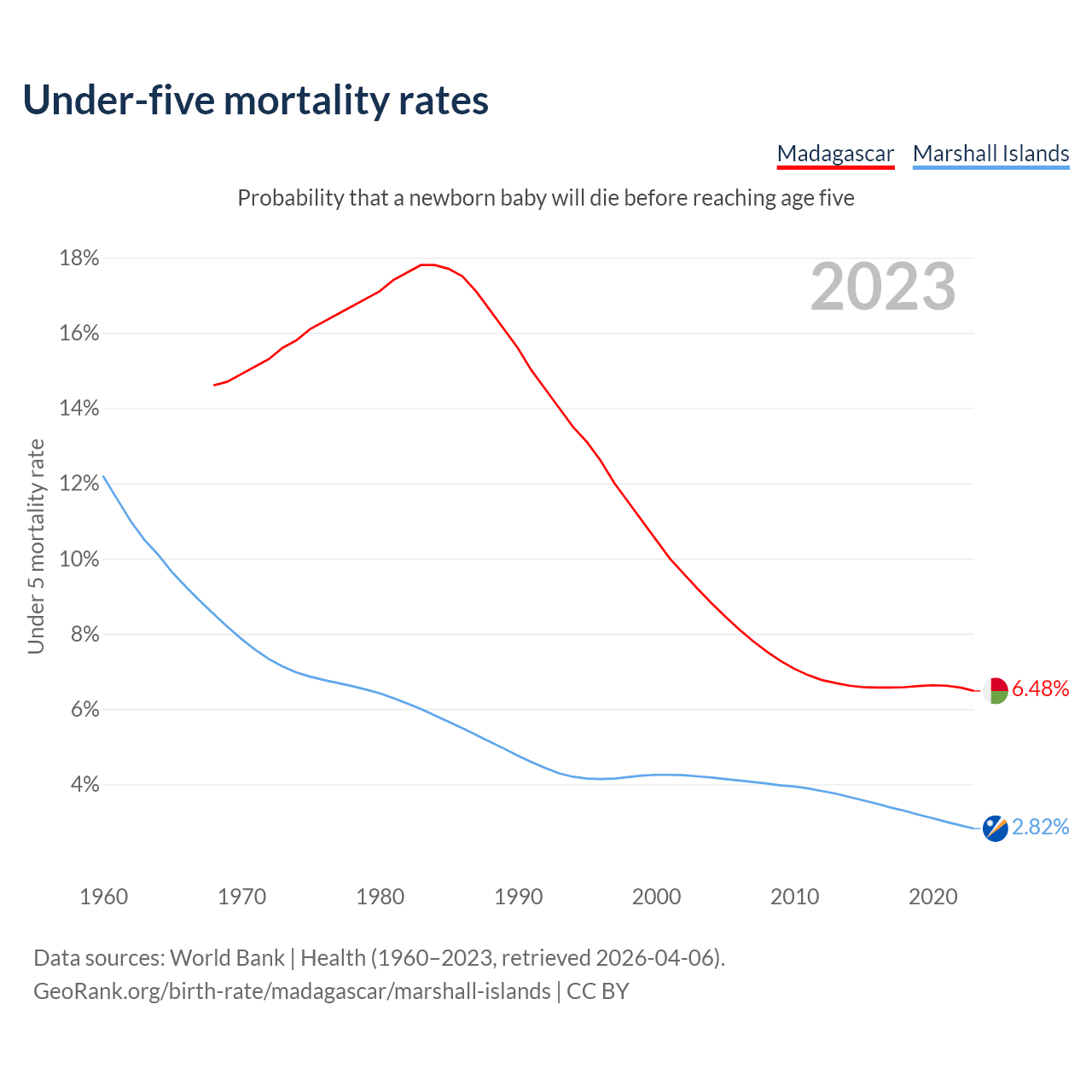 The chance that a newborn baby will die before reaching age five is 6.48% in Madagascar and 2.82% in the Marshall Islands. Above is a chart with historical data on under-five mortality rates.