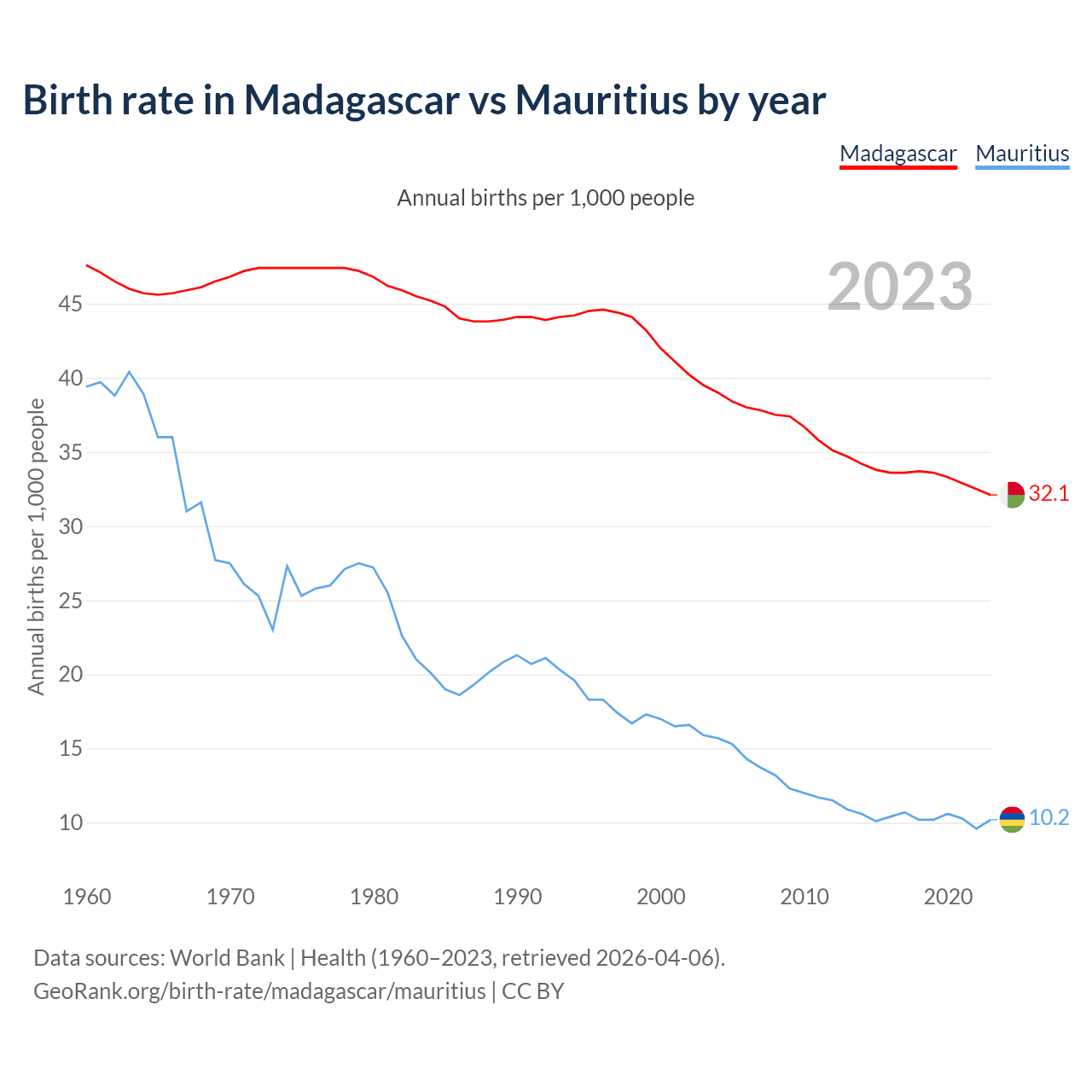 Madagascar has an annual birth rate of 32.1 births per 1,000 people, compared to 10.2 for Mauritius. The average number of children a woman is expected to have during her lifetime — the fertility rate, is 3.97 in Madagascar and 1.39 in Mauritius — 65% difference.