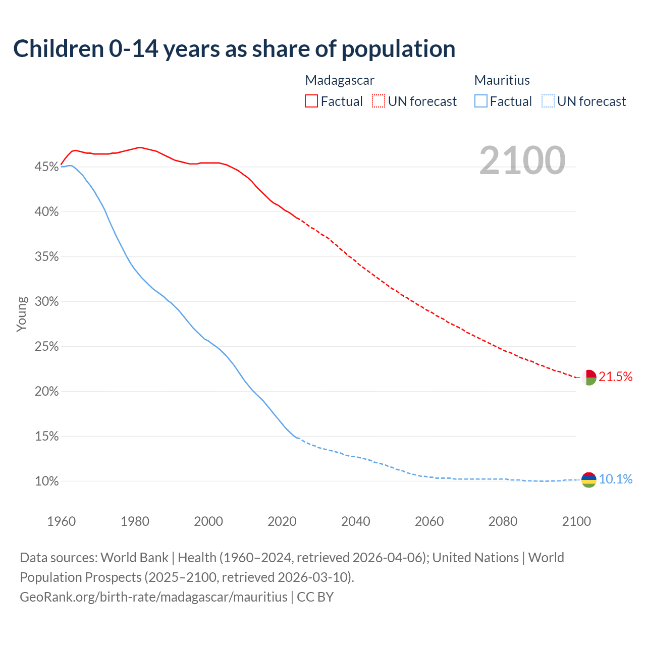 According to the latest available data on birth rates, the fertility rate in Madagascar was 3.97 children per woman in 2023, compared to 1.39 in Mauritius in 2023. The replacement level is considered to be 2.1 children per woman.