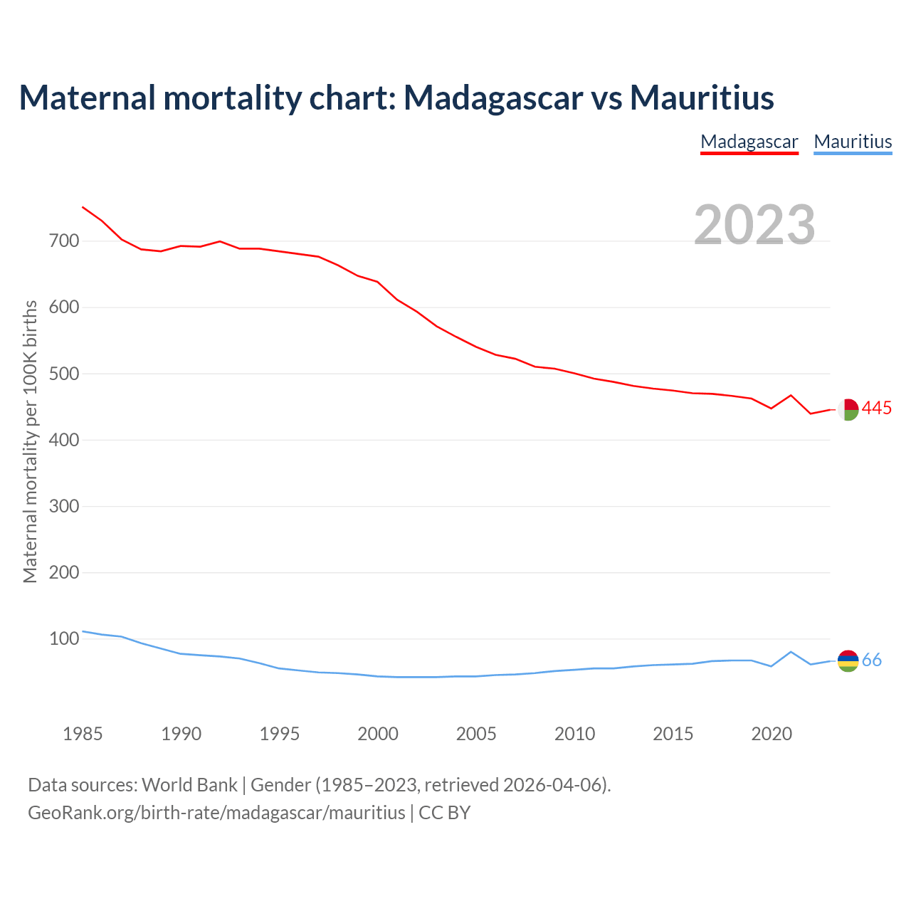 The maternal mortality rate, which is the probability of dying during childbirth or within 42 days of pregnancy termination, is 445 deaths per 100,000 live births in Madagascar, compared to 66 deaths in Mauritius.