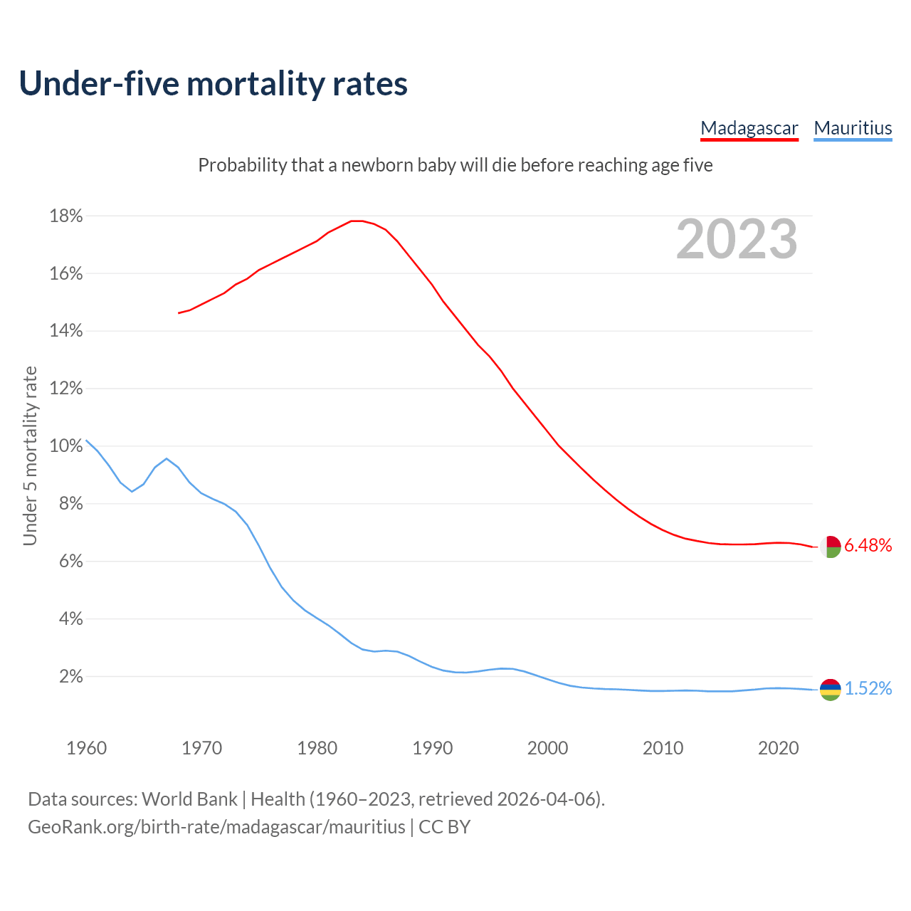 The chance that a newborn baby will die before reaching age five is 6.48% in Madagascar and 1.52% in Mauritius. Above is a chart with historical data on under-five mortality rates.