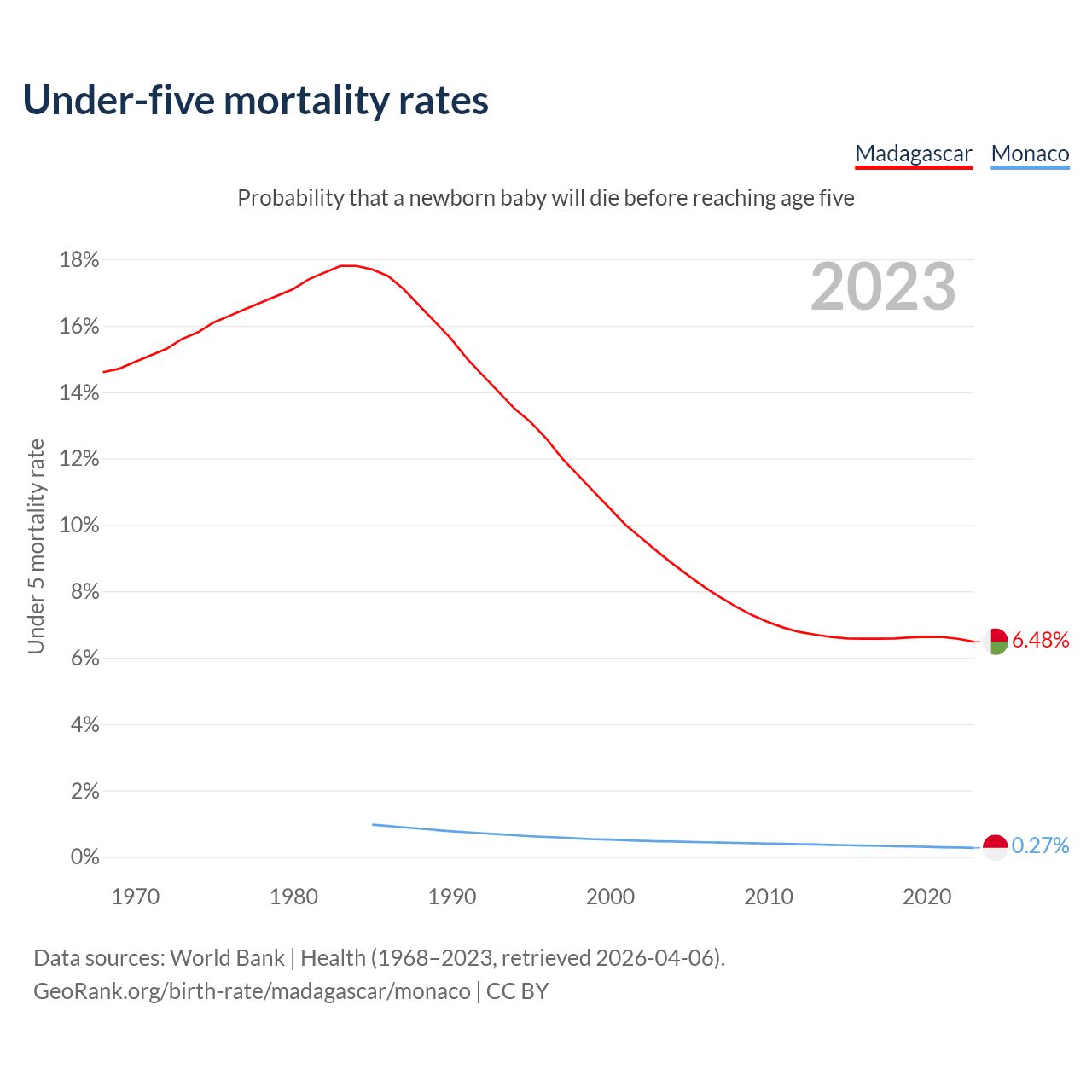 The chance that a newborn baby will die before reaching age five is 6.48% in Madagascar and 0.27% in Monaco. Above is a chart with historical data on under-five mortality rates.