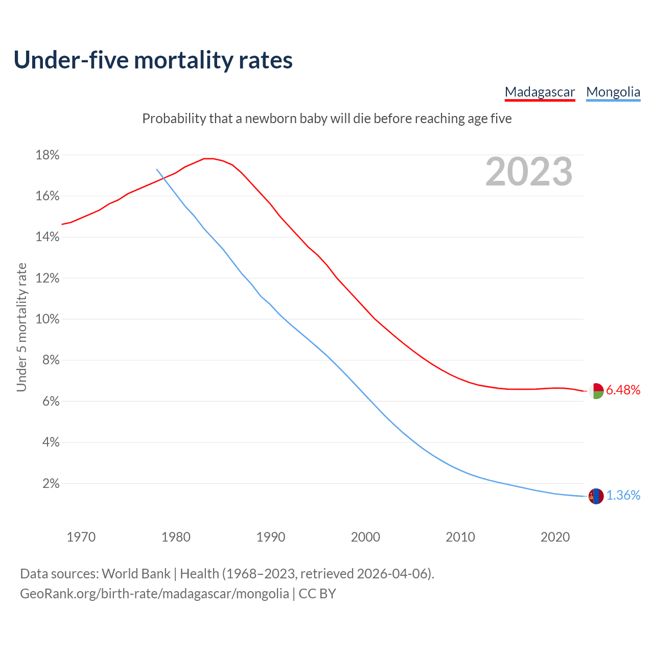 The chance that a newborn baby will die before reaching age five is 6.48% in Madagascar and 1.36% in Mongolia. Above is a chart with historical data on under-five mortality rates.
