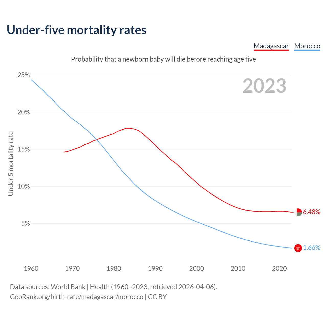 The chance that a newborn baby will die before reaching age five is 6.48% in Madagascar and 1.66% in Morocco. Above is a chart with historical data on under-five mortality rates.