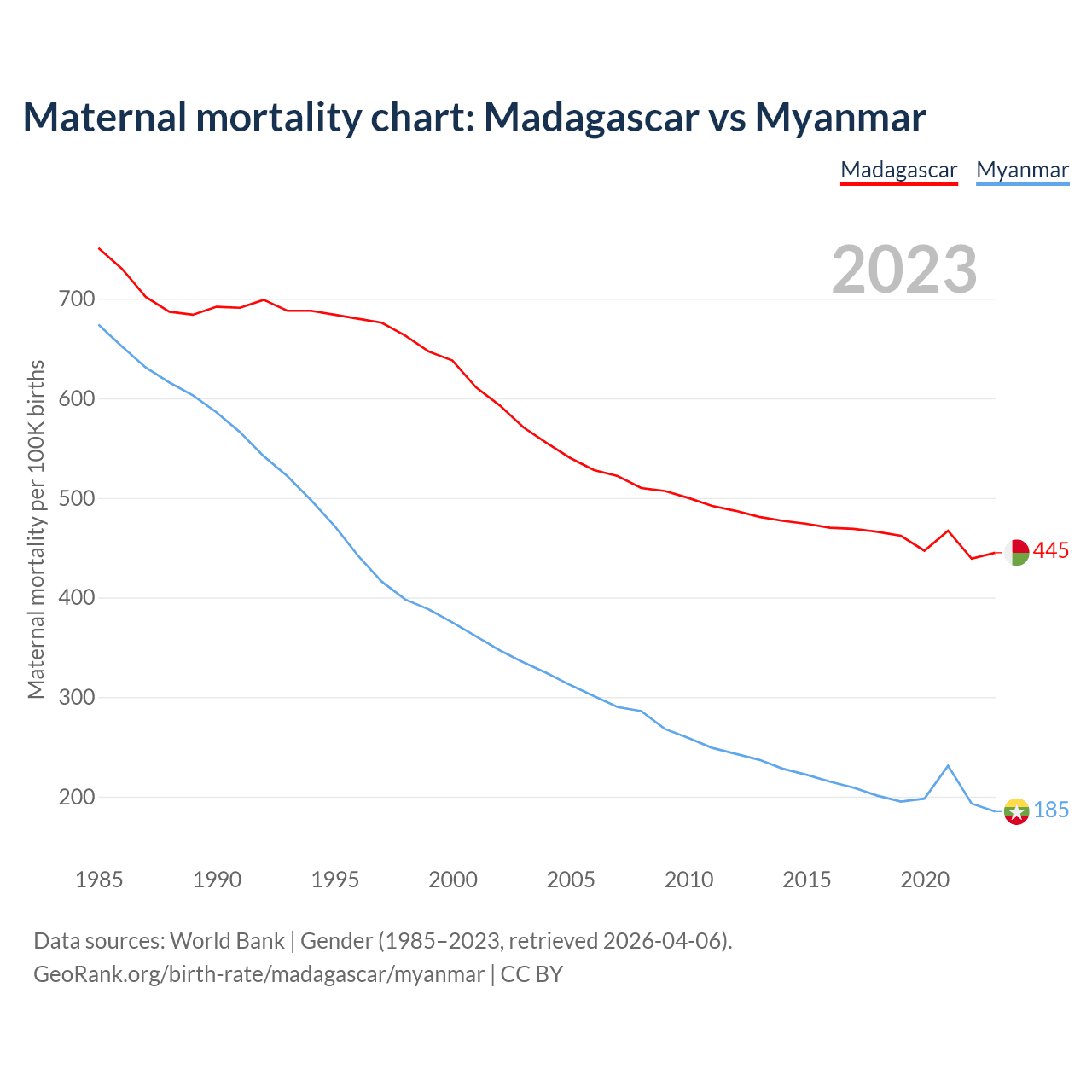 The maternal mortality rate, which is the probability of dying during childbirth or within 42 days of pregnancy termination, is 445 deaths per 100,000 live births in Madagascar, compared to 185 deaths in Myanmar.