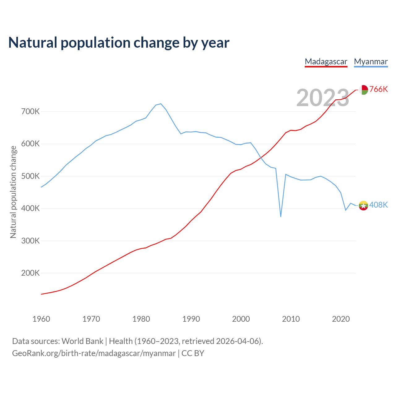 Madagascar has an annual birth rate of 32.1 births per 1,000 people, compared to 16.7 for Myanmar. The average number of children a woman is expected to have during her lifetime — the fertility rate, is 3.97 in Madagascar and 2.12 in Myanmar — 46.8% difference.