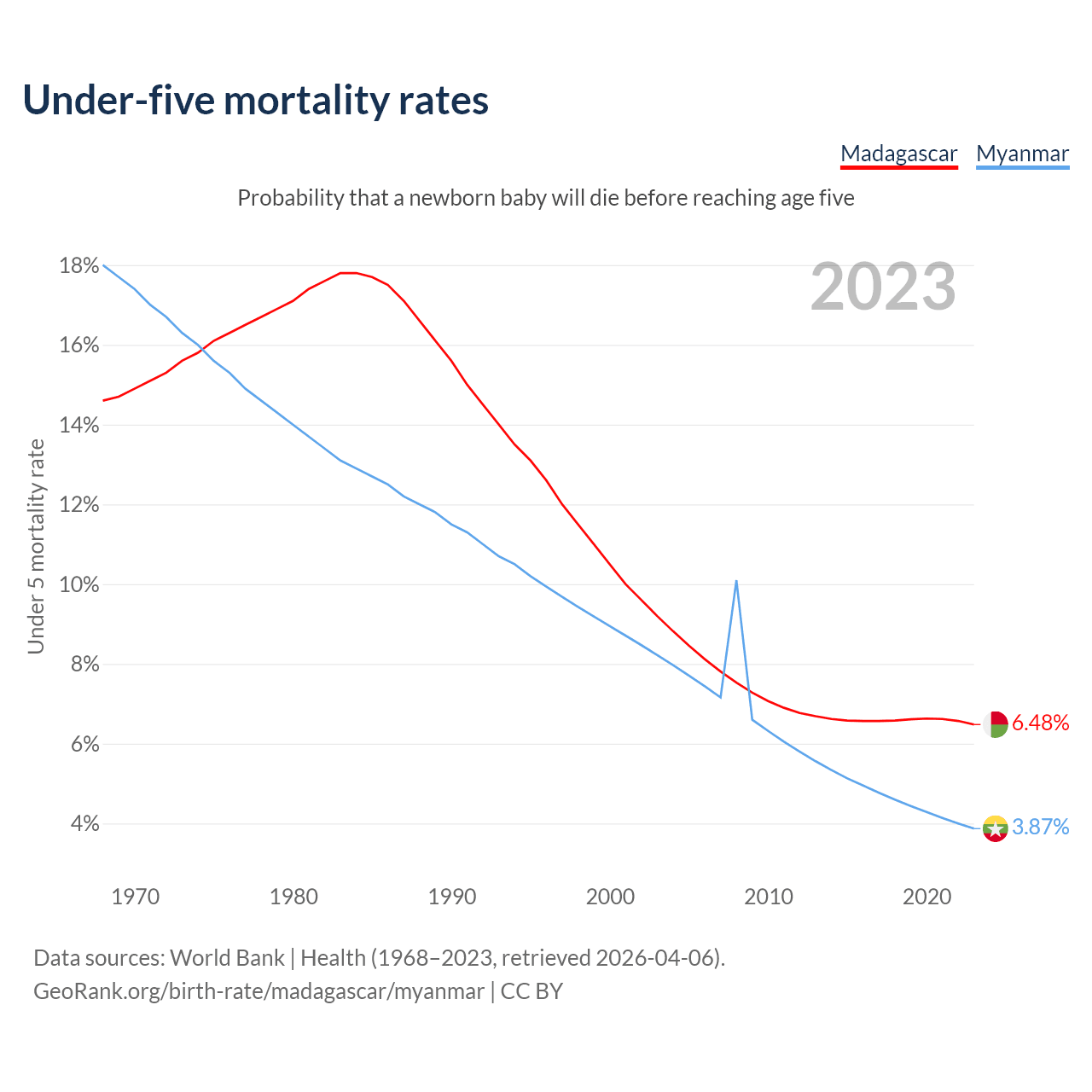 The chance that a newborn baby will die before reaching age five is 6.48% in Madagascar and 3.87% in Myanmar. Above is a chart with historical data on under-five mortality rates.