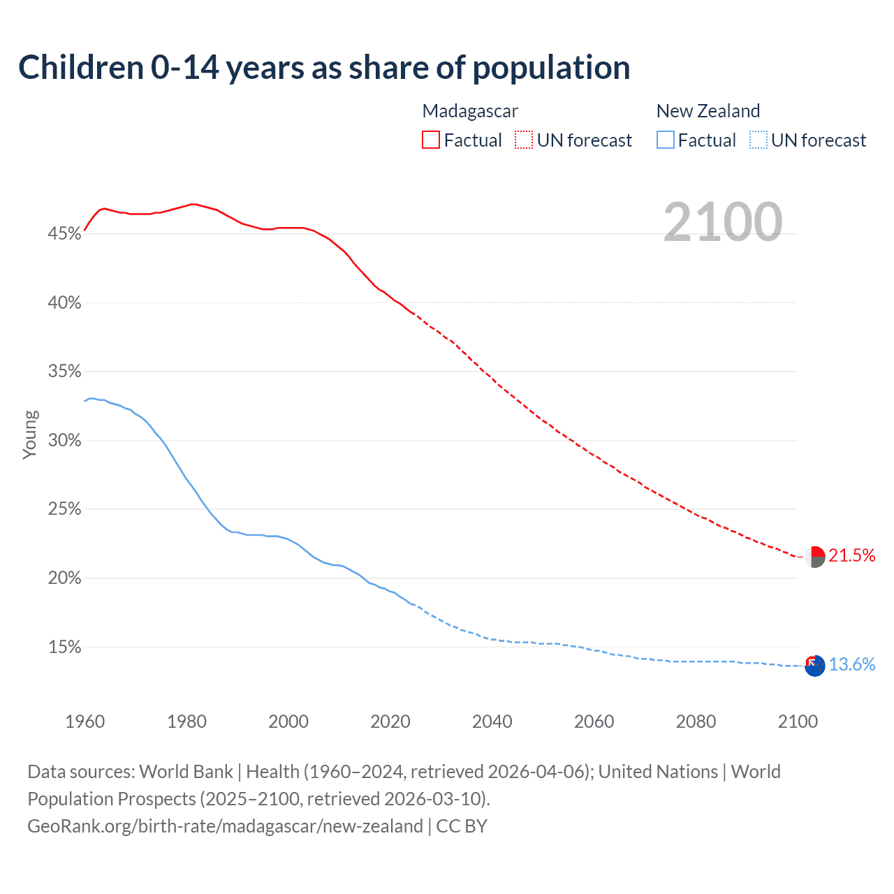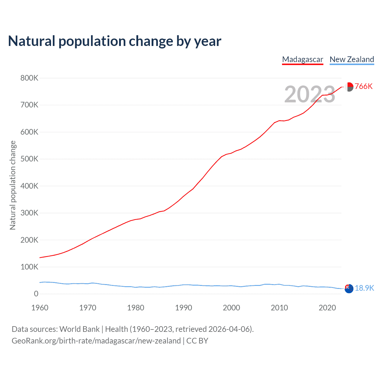 Madagascar has an annual birth rate of 32.1 births per 1,000 people, compared to 10.9 for New Zealand. The average number of children a woman is expected to have during her lifetime — the fertility rate, is 3.97 in Madagascar and 1.56 in New Zealand — 60.7% difference.