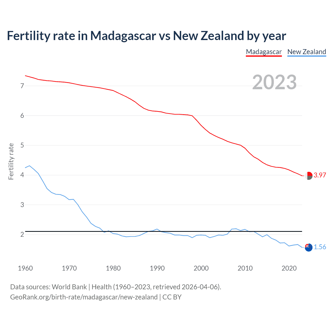 According to the latest available data on birth rates, the fertility rate in Madagascar was 3.97 children per woman in 2023, compared to 1.56 in New Zealand in 2023. The replacement level is considered to be 2.1 children per woman.