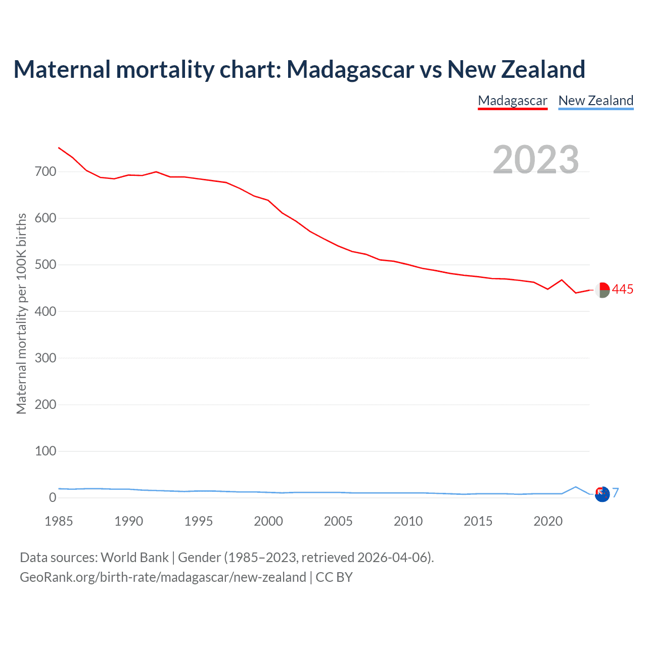 The maternal mortality rate, which is the probability of dying during childbirth or within 42 days of pregnancy termination, is 445 deaths per 100,000 live births in Madagascar, compared to 7 deaths in New Zealand.
