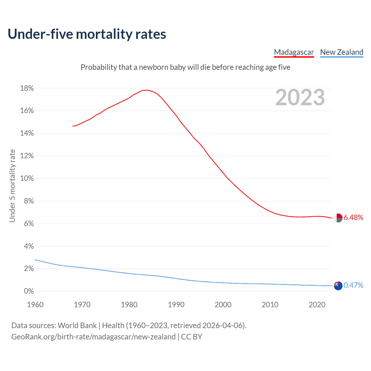 The chance that a newborn baby will die before reaching age five is 6.48% in Madagascar and 0.47% in New Zealand. Above is a chart with historical data on under-five mortality rates.