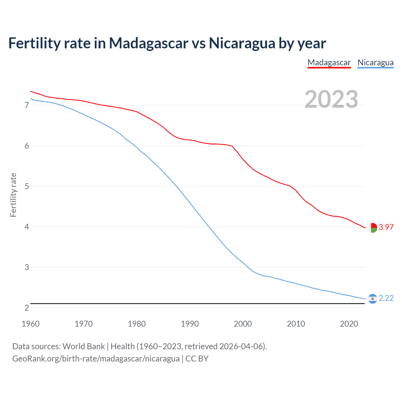 1960 vs 2023, the fertility rate has decreased by 45.9% in Madagascar and by 69% in Nicaragua — in 1960, it was 7.34 and 7.16, respectively.