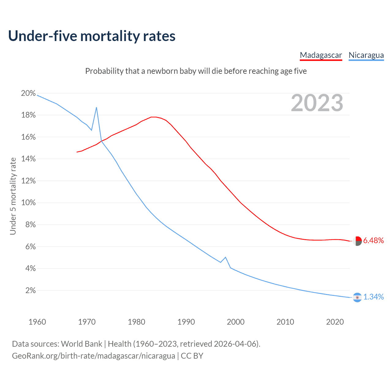 The chance that a newborn baby will die before reaching age five is 6.48% in Madagascar and 1.34% in Nicaragua. Above is a chart with historical data on under-five mortality rates.
