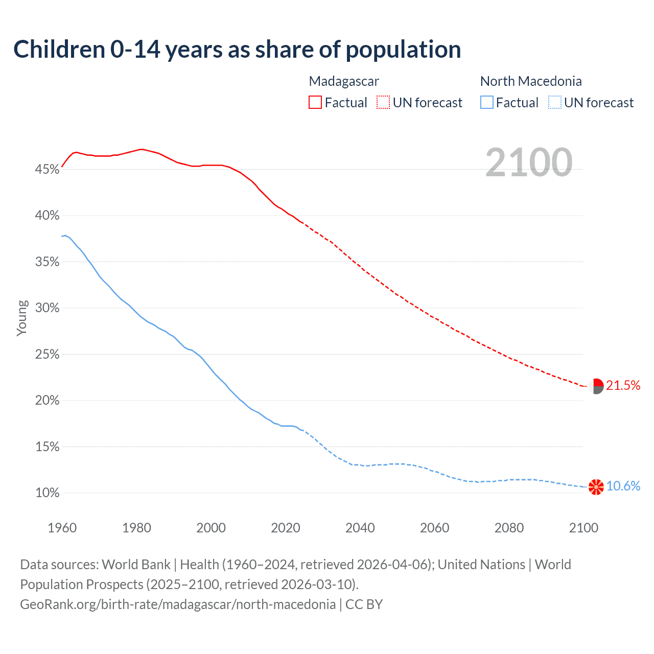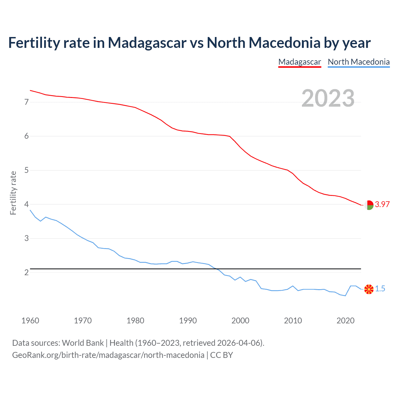 According to the latest available data on birth rates, the fertility rate in Madagascar was 3.97 children per woman in 2023, compared to 1.5 in North Macedonia in 2023. The replacement level is considered to be 2.1 children per woman.