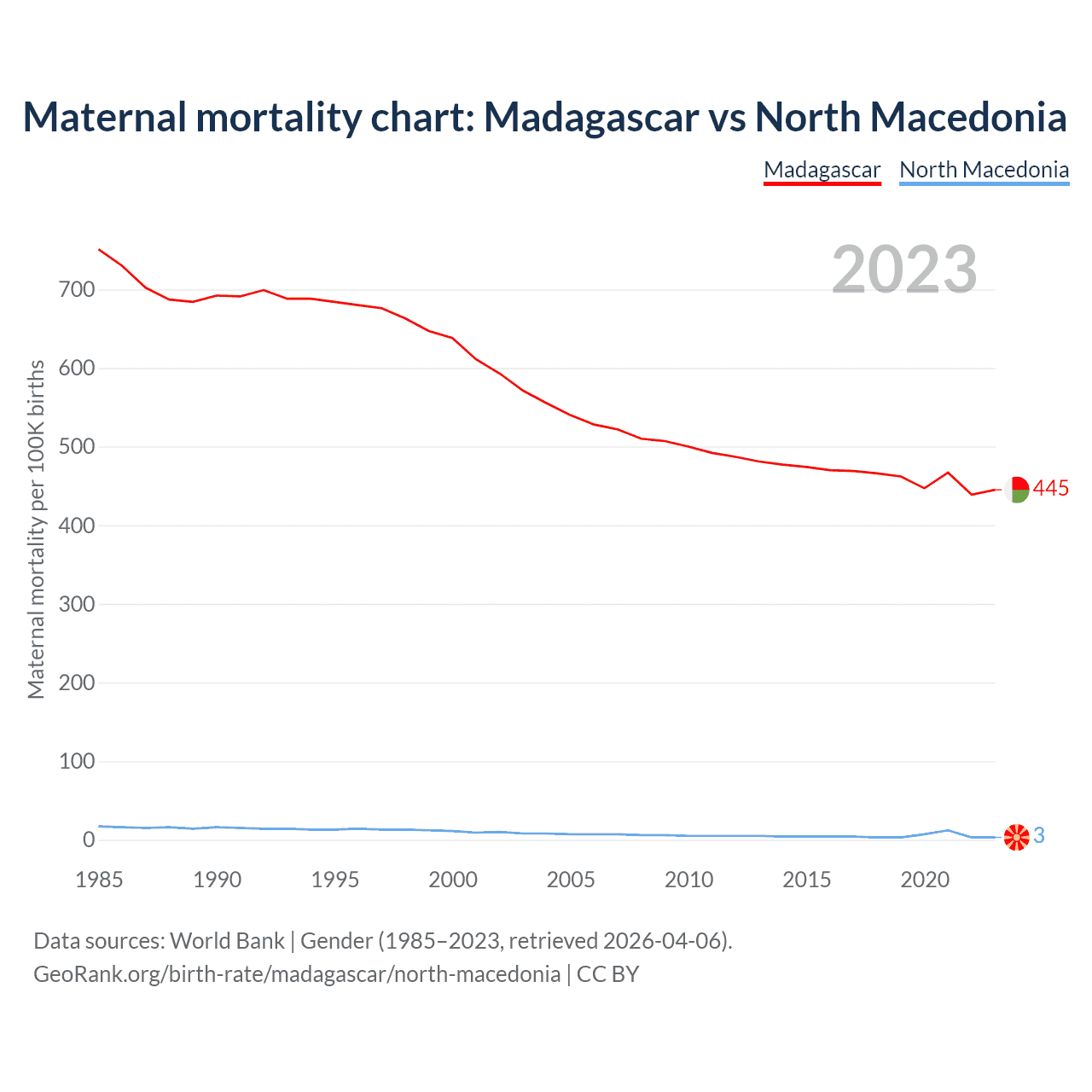 The maternal mortality rate, which is the probability of dying during childbirth or within 42 days of pregnancy termination, is 445 deaths per 100,000 live births in Madagascar, compared to 3 deaths in North Macedonia.