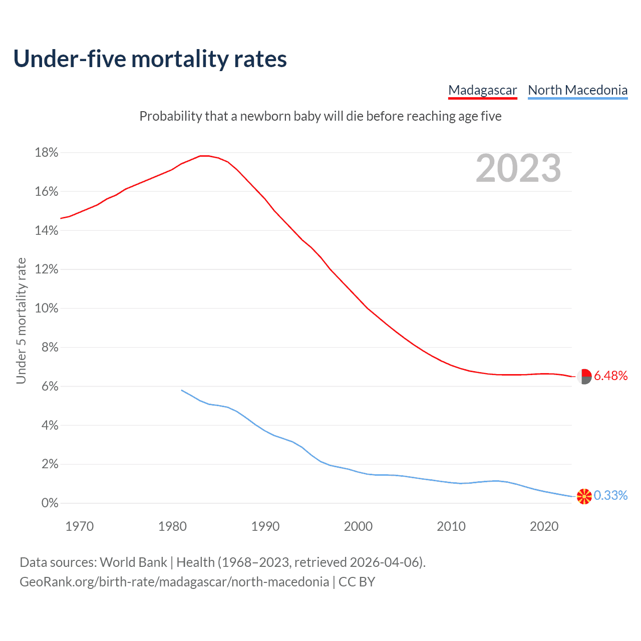 The chance that a newborn baby will die before reaching age five is 6.48% in Madagascar and 0.33% in North Macedonia. Above is a chart with historical data on under-five mortality rates.