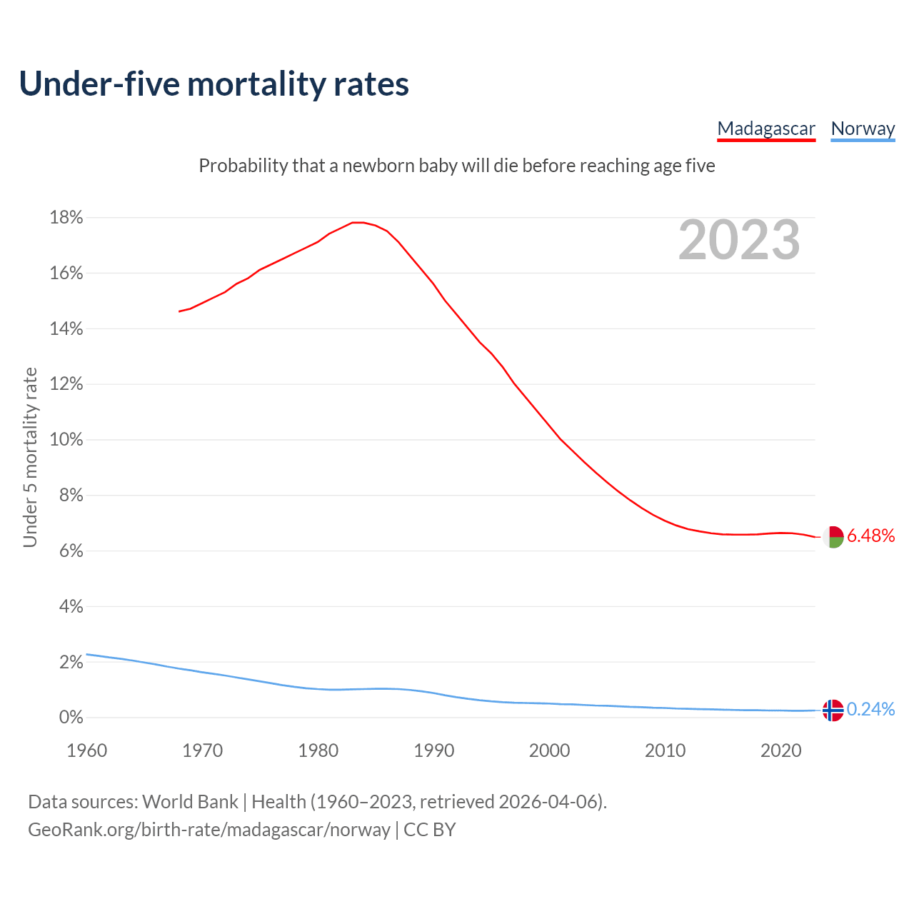 The chance that a newborn baby will die before reaching age five is 6.48% in Madagascar and 0.24% in Norway. Above is a chart with historical data on under-five mortality rates.
